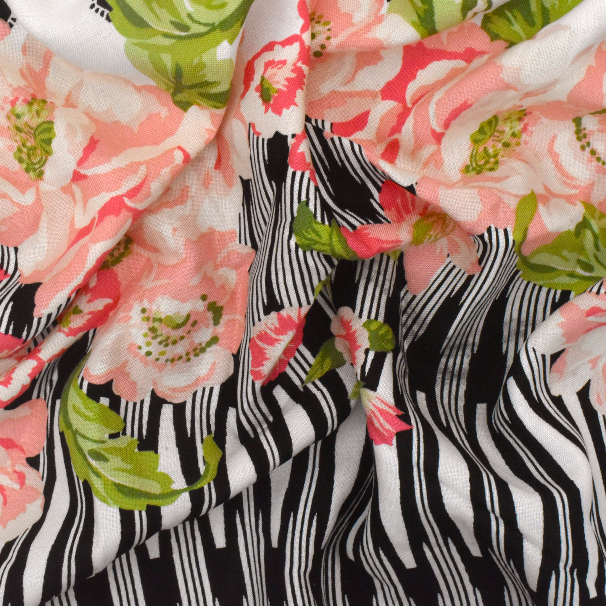 3 1/2 YD PC-Ivory-Pink-Multi Floral Border Stripe Printed Challis Woven Fabric