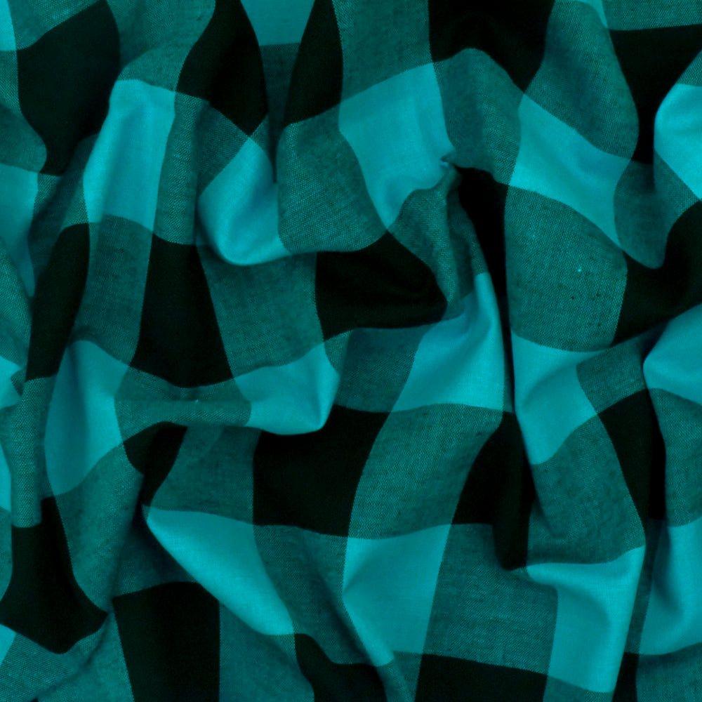 Bright Teal-Black Gingham Stretch Cotton Woven Fabric