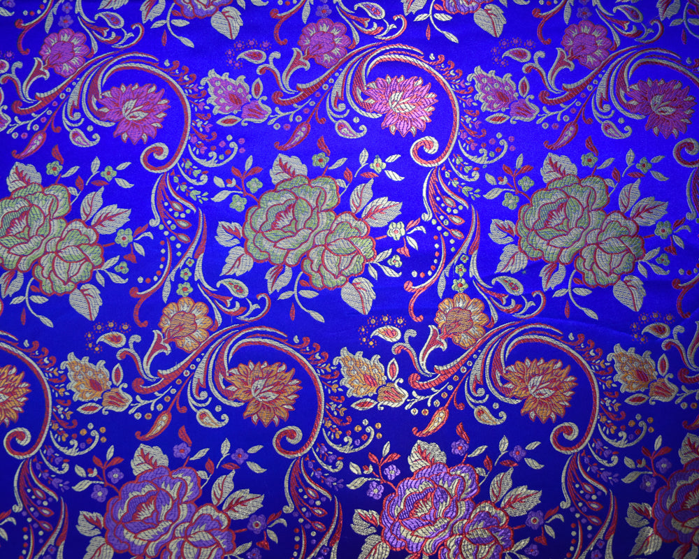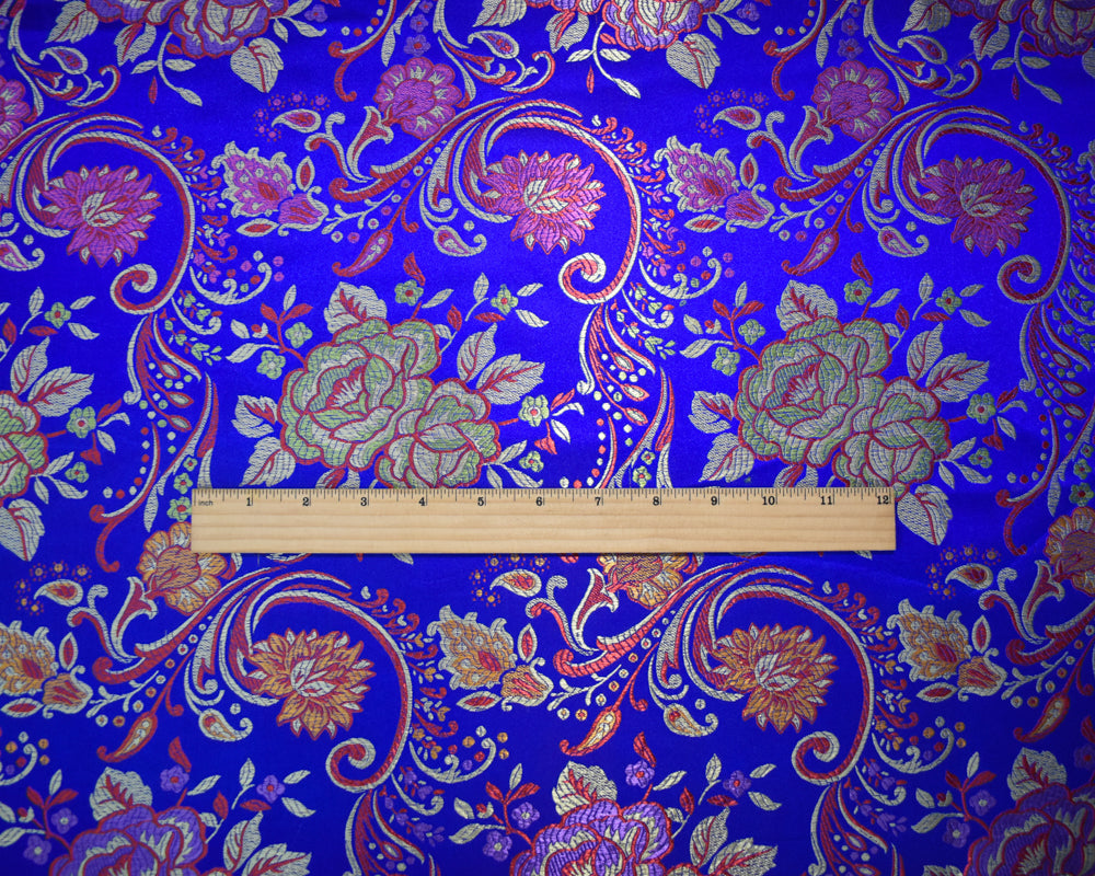 Blue-Yellow-Multi Polyester Floral Vine Chinese Brocade Woven Fabric