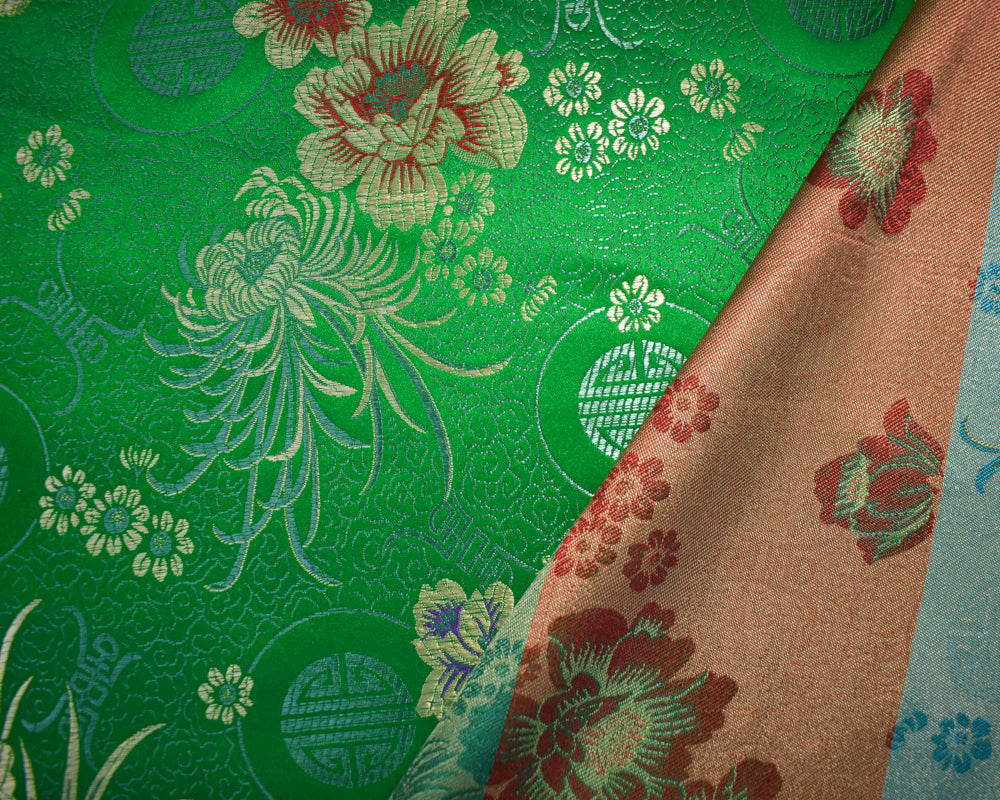 Green-Yellow-Multi Polyester Floral Chinese Brocade Woven Fabric