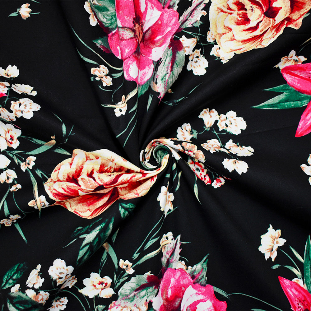 Black-Pink-Beige Cotton Stretch Spandex Floral Print Poplin Woven Fabric