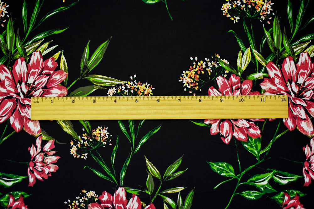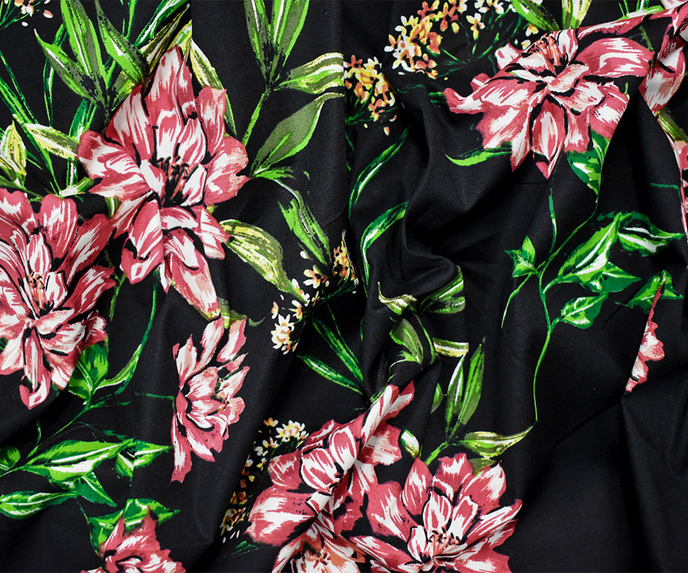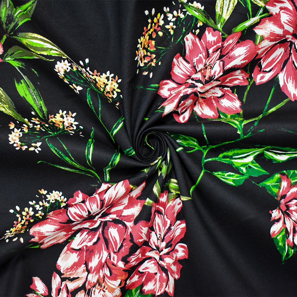Black-Red-Multi Cotton Floral Printed Stretch Spandex Poplin Woven Fabric