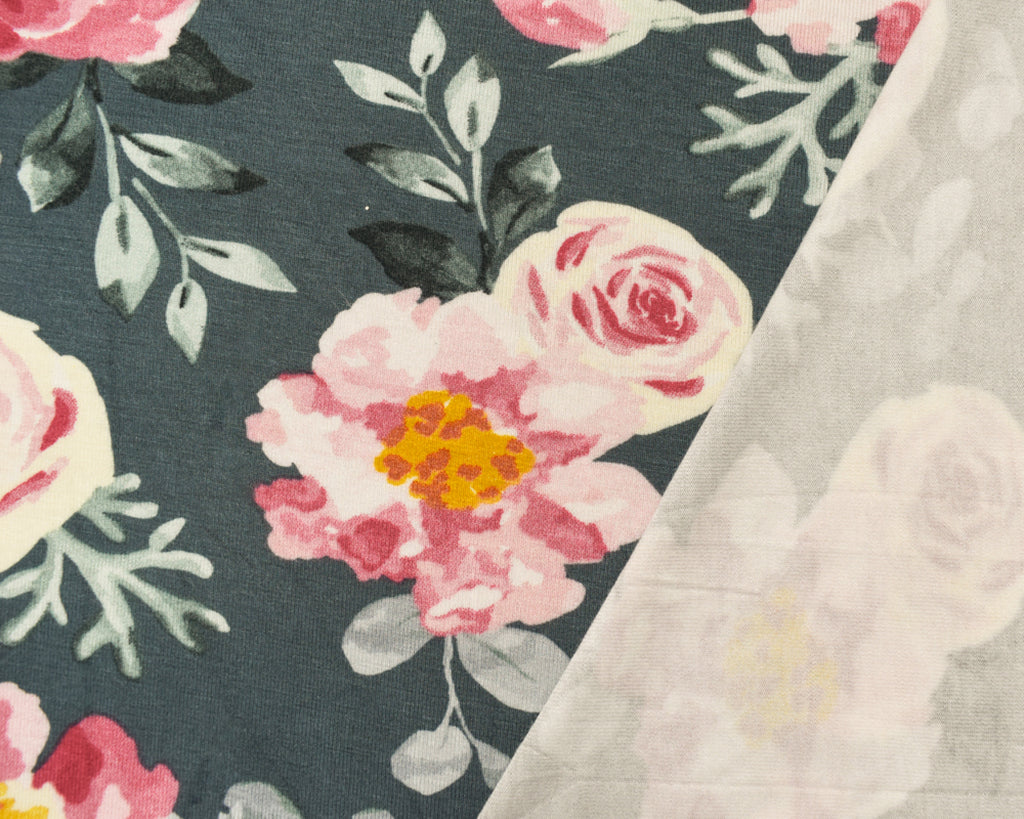 -Rayon and modal blend stretch spandex jersey knit fabric printed with a stylized floral pattern