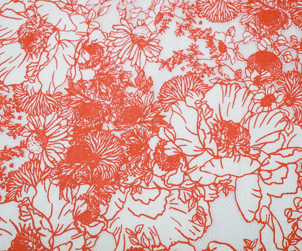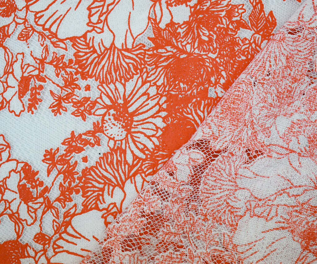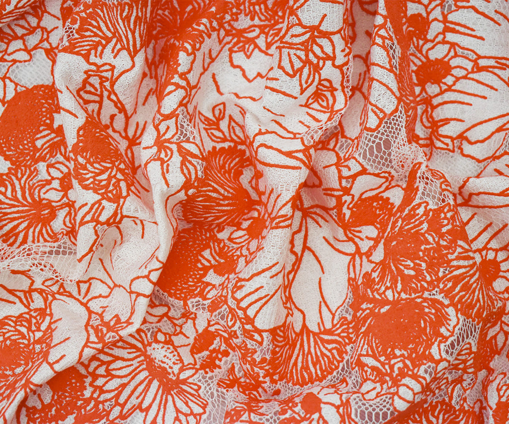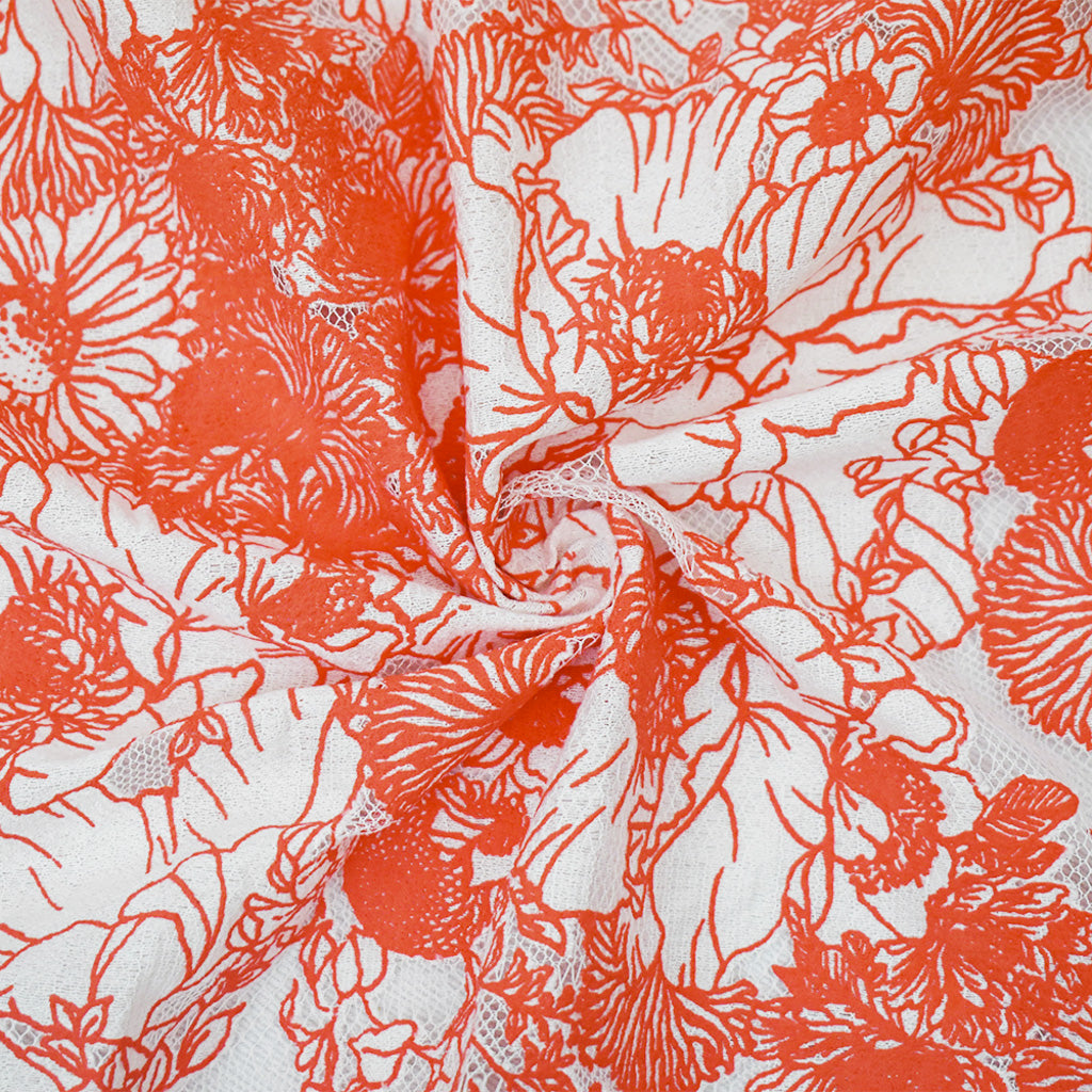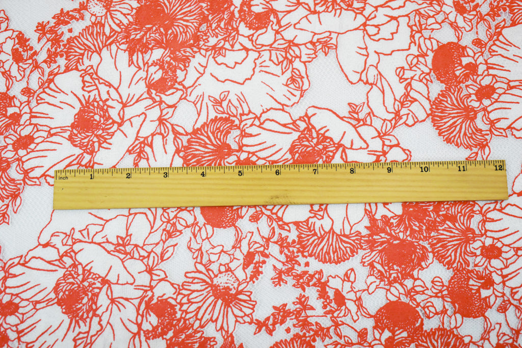 Orange-White Cotton Nylon Floral Printed Crochet Lace Mesh Knit Fabric