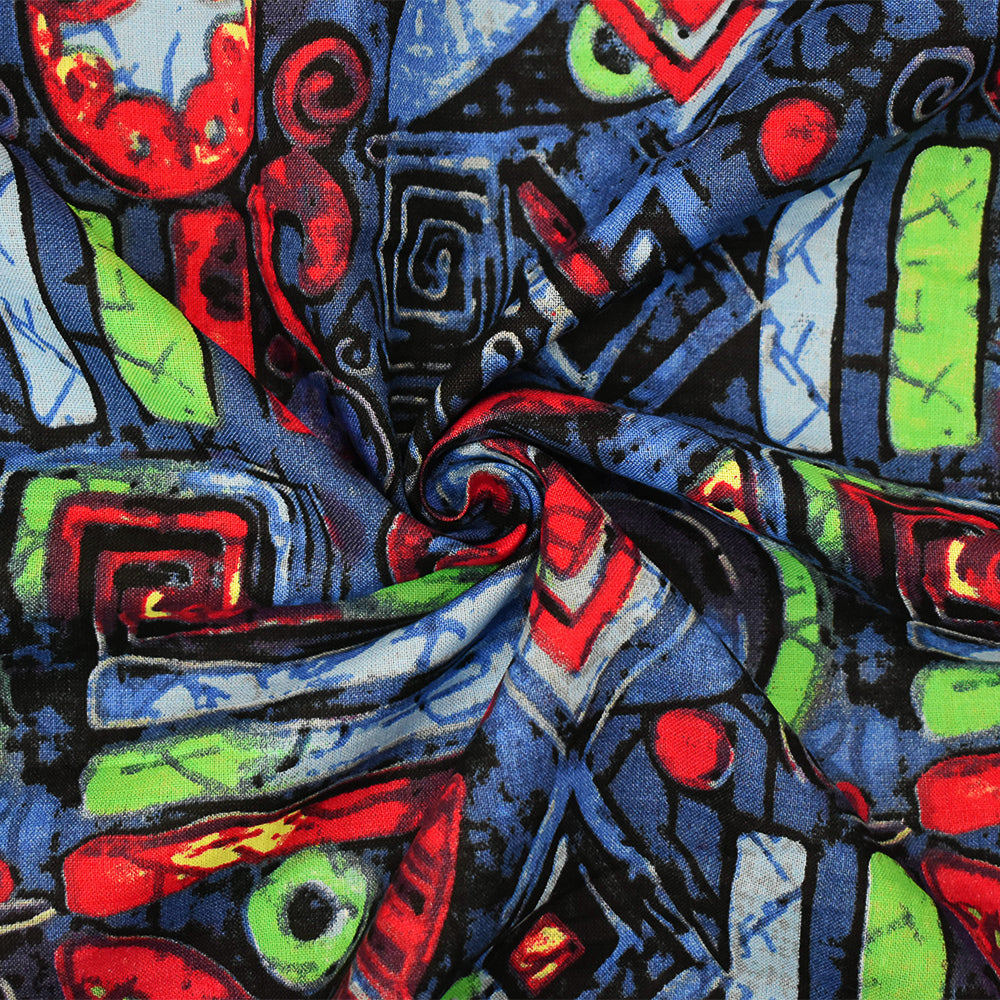 Blue-Red-Multi Abstract Geometry Art Pattern Printed Linen Woven Fabric