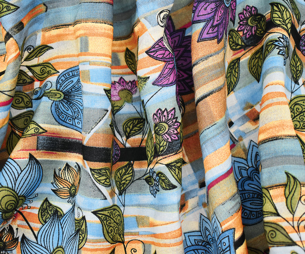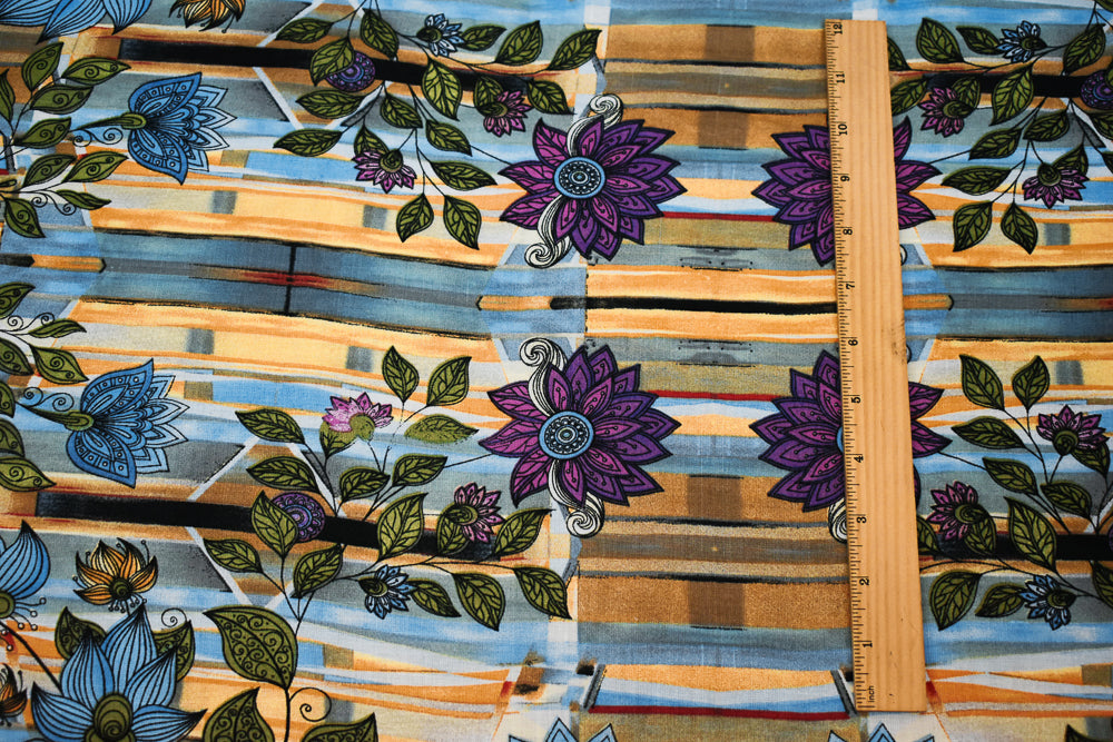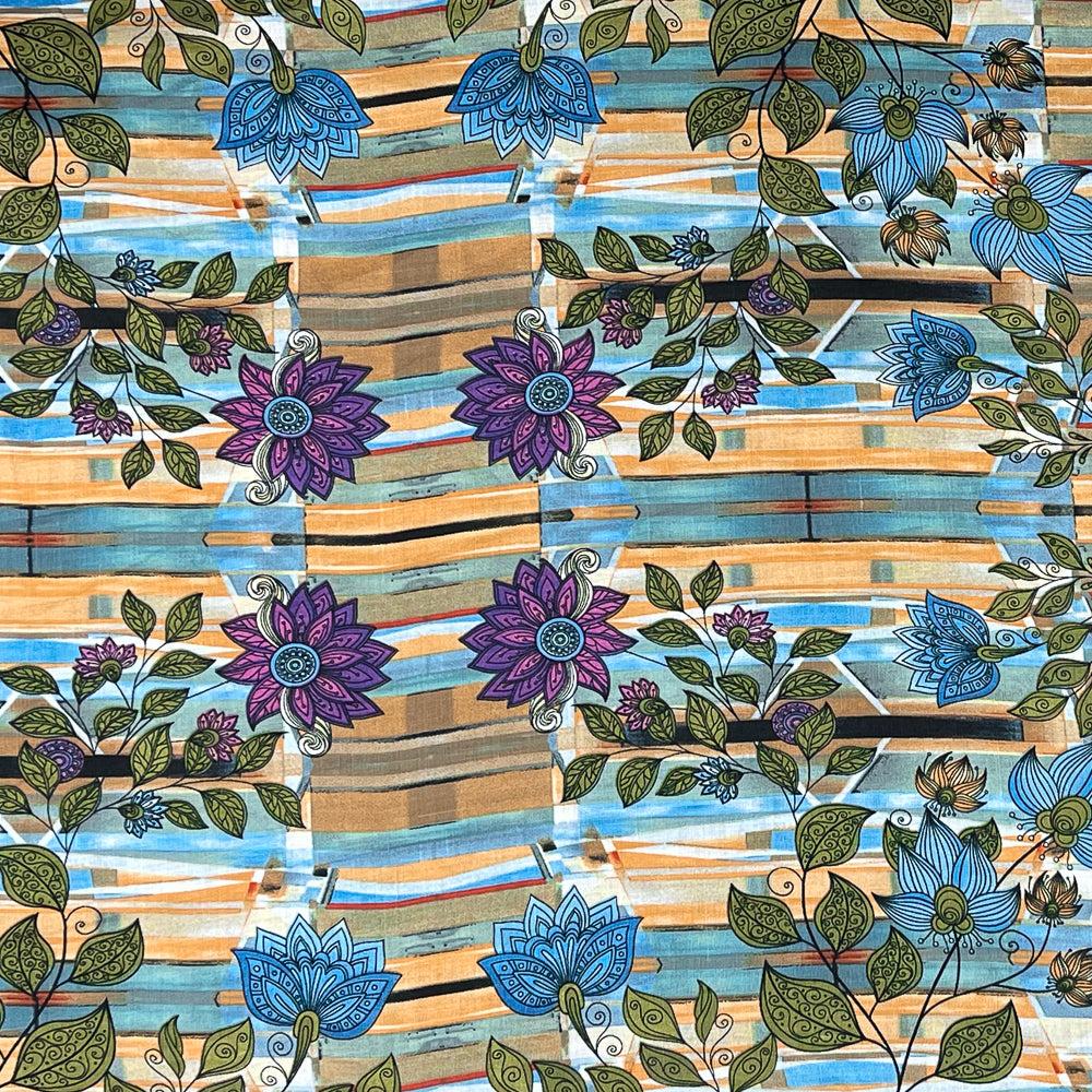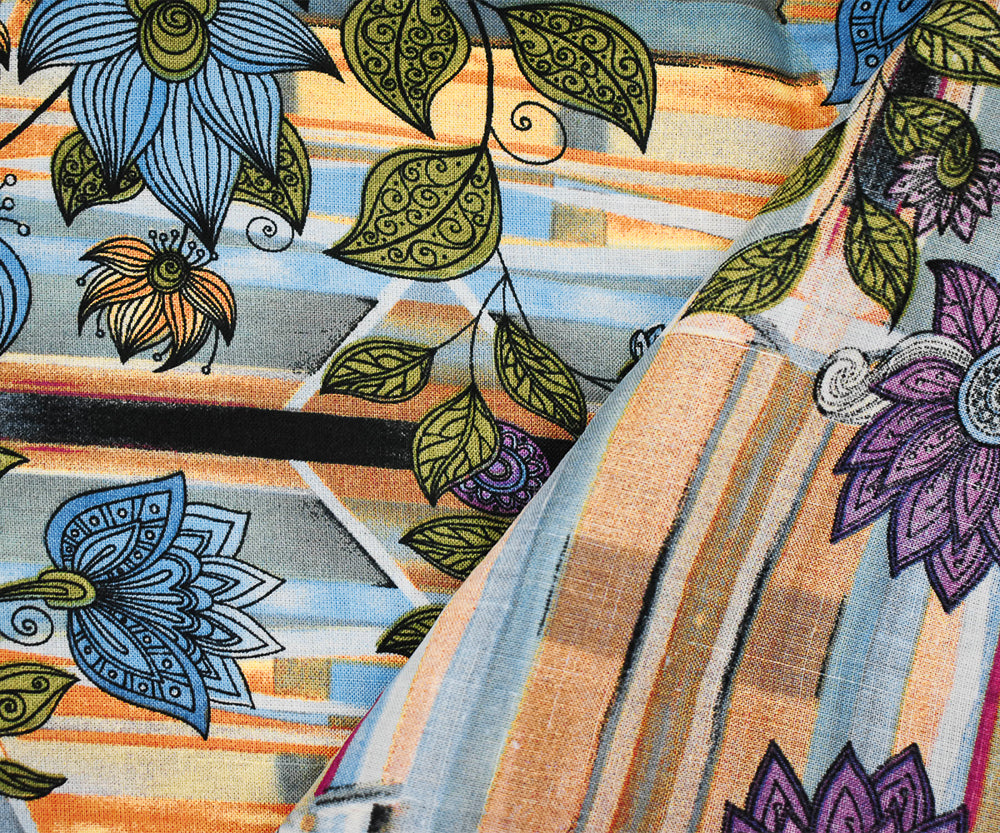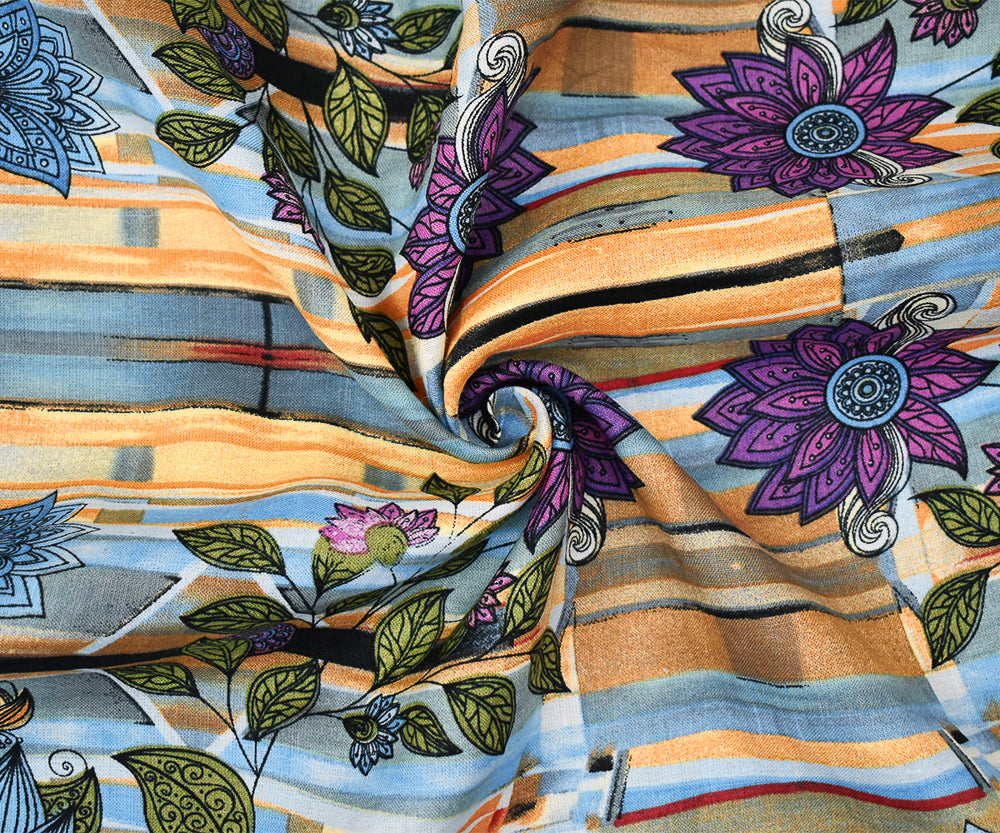 Blue-Yellow-Multi Floral Stripe Printed Linen Woven Fabric