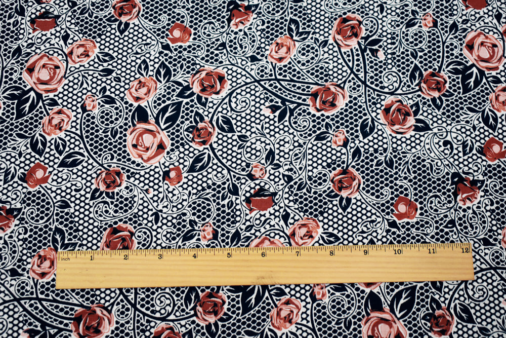 Navy-Peach-Orange Floral Mesh Pattern Printed Linen Woven Fabric