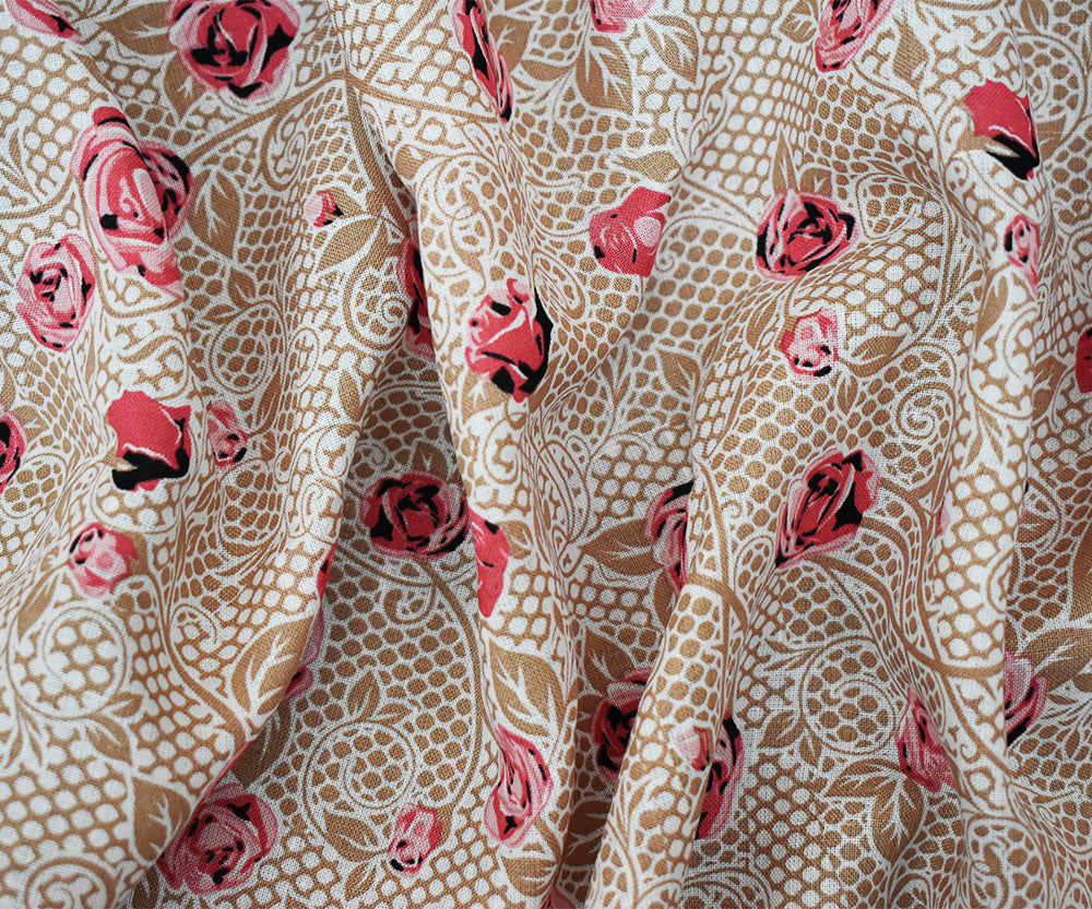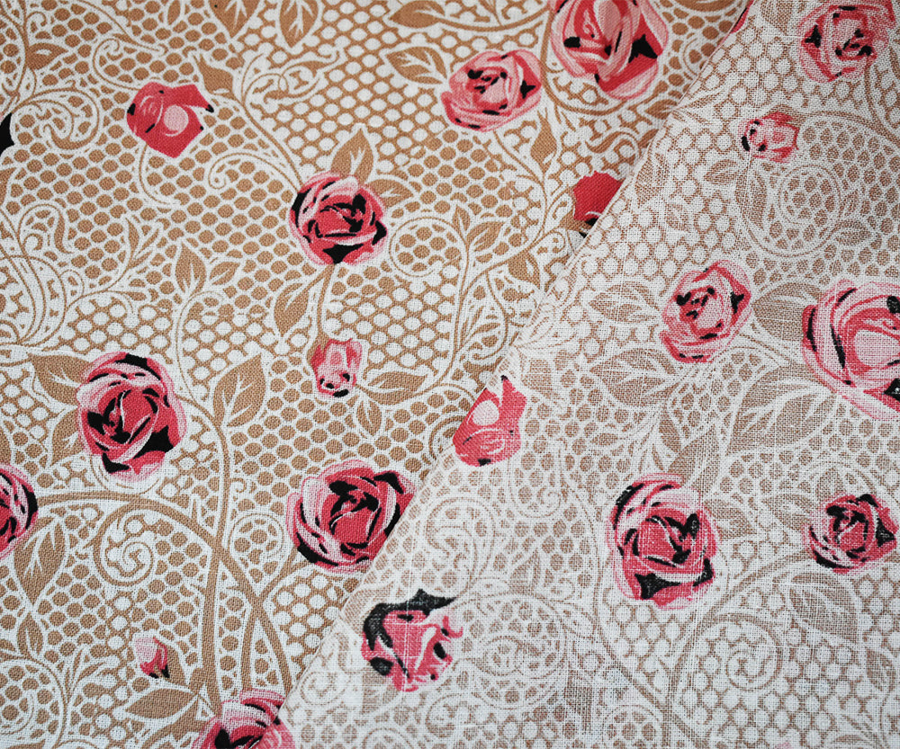 Pink-Beige-Multi Floral Mesh Pattern Printed Linen Woven Fabric