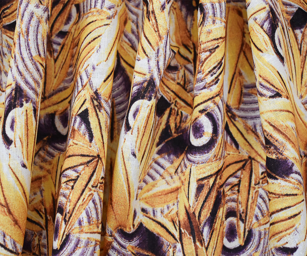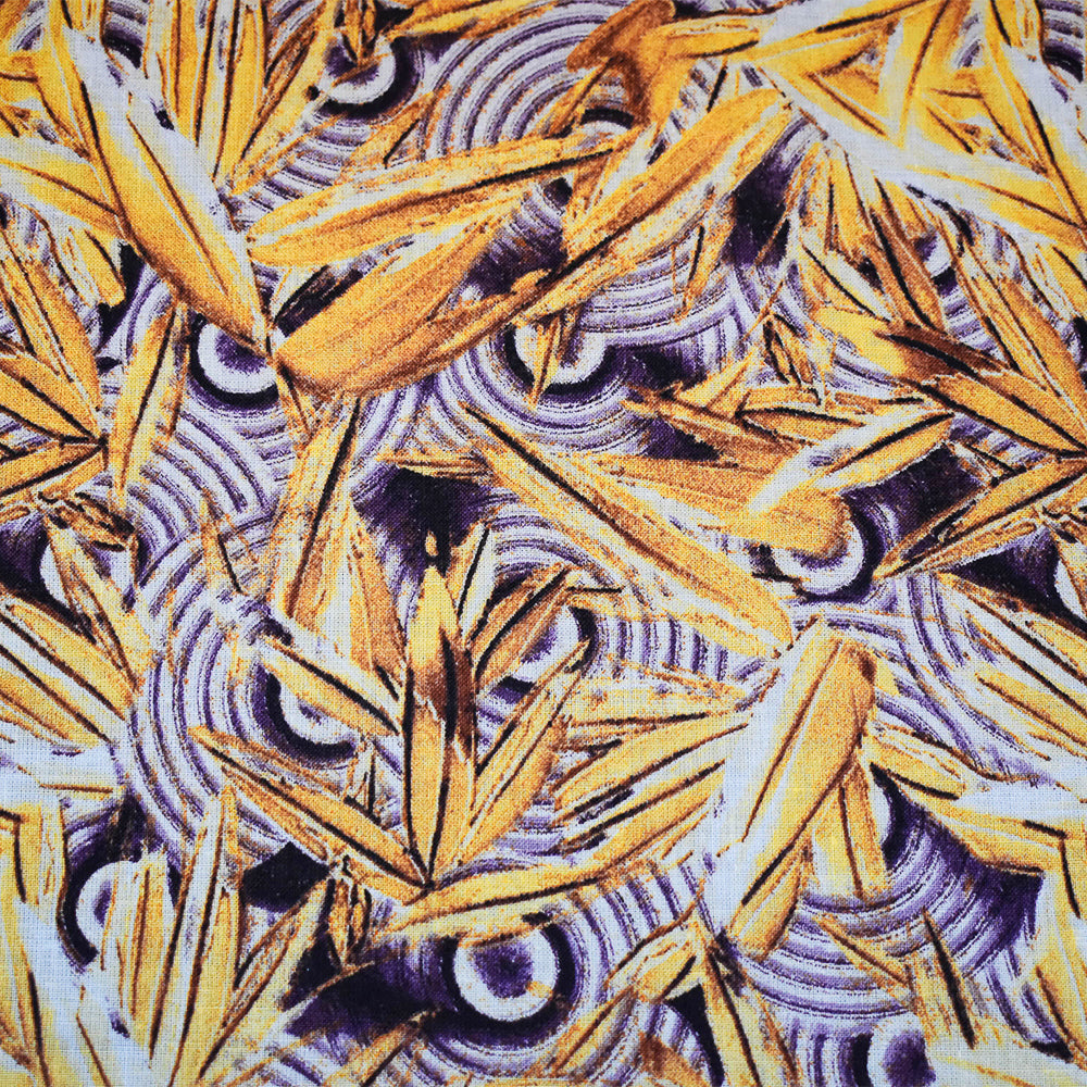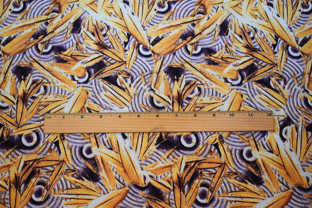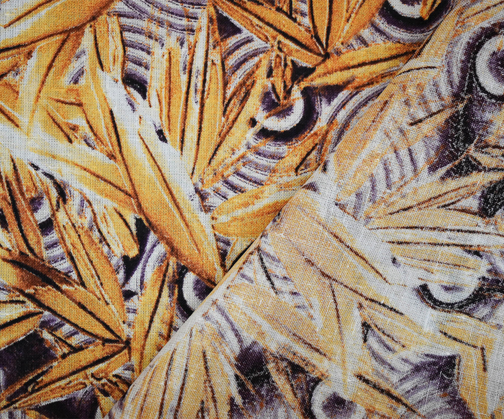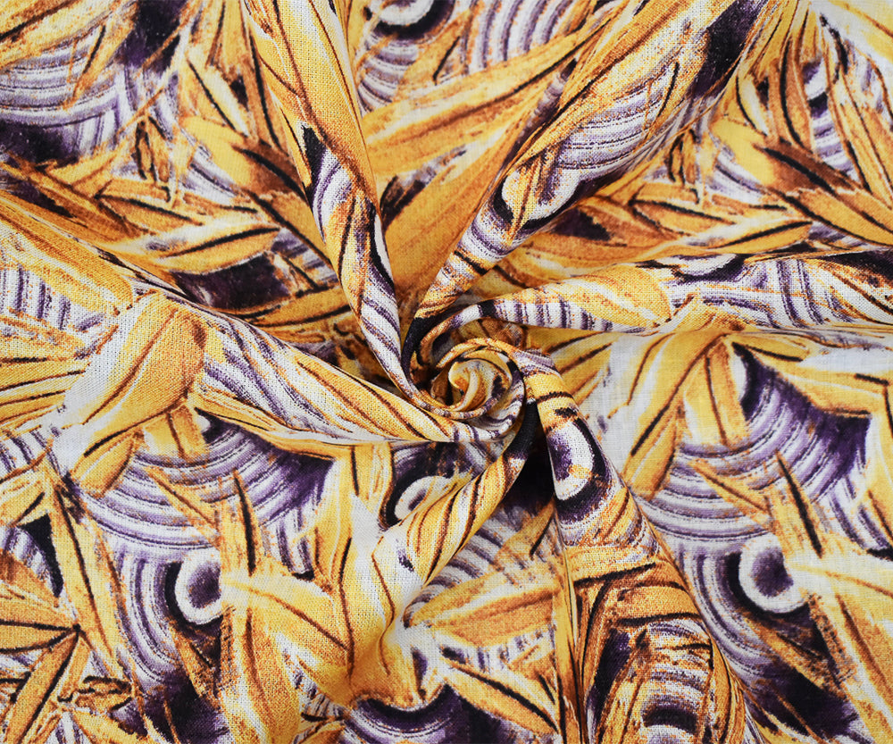 Purple-Yellow-Multi Abstract Whirl Leaf Pattern Printed Linen Woven Fabric