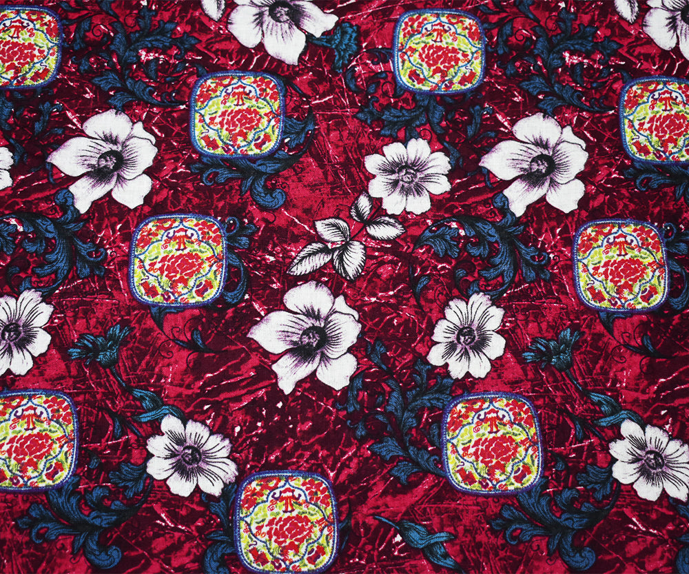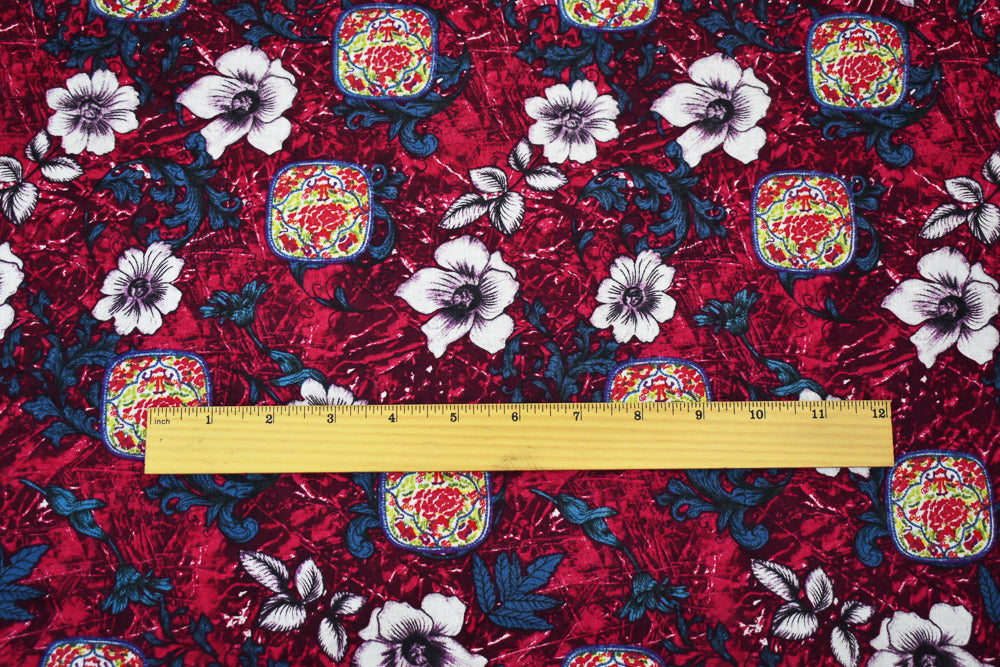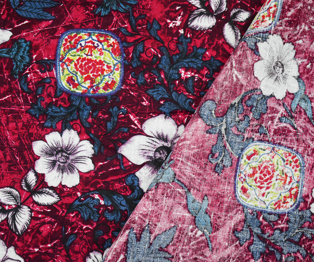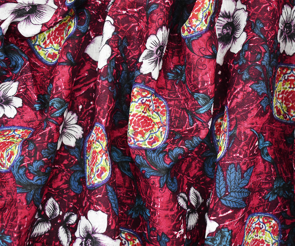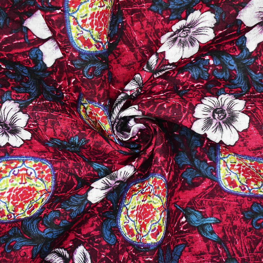 Red-Blue-Purple Floral Leaf Art Printed Linen Woven Fabric
