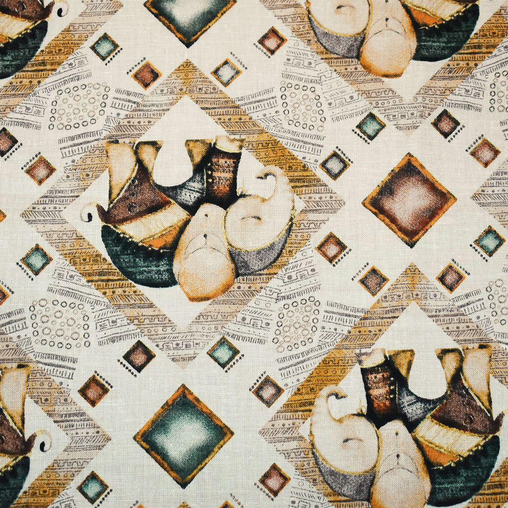 White-Yellow-Multi Elephant Diamond Pattern Printed Linen Woven Fabric