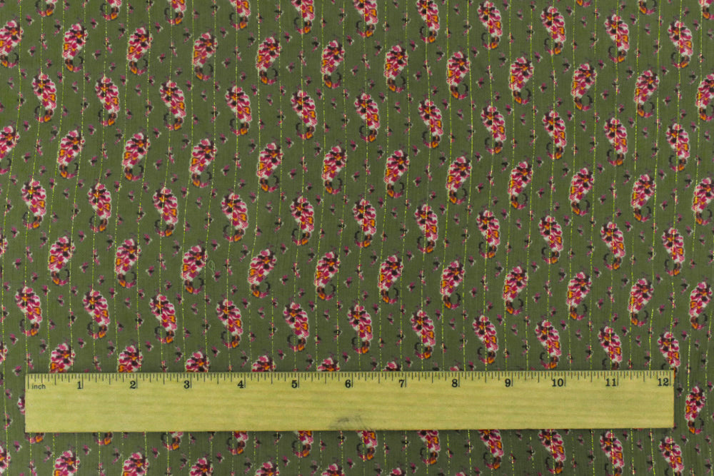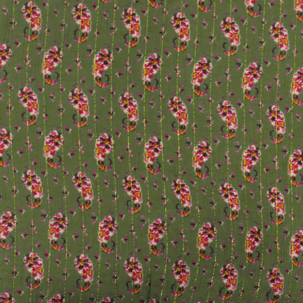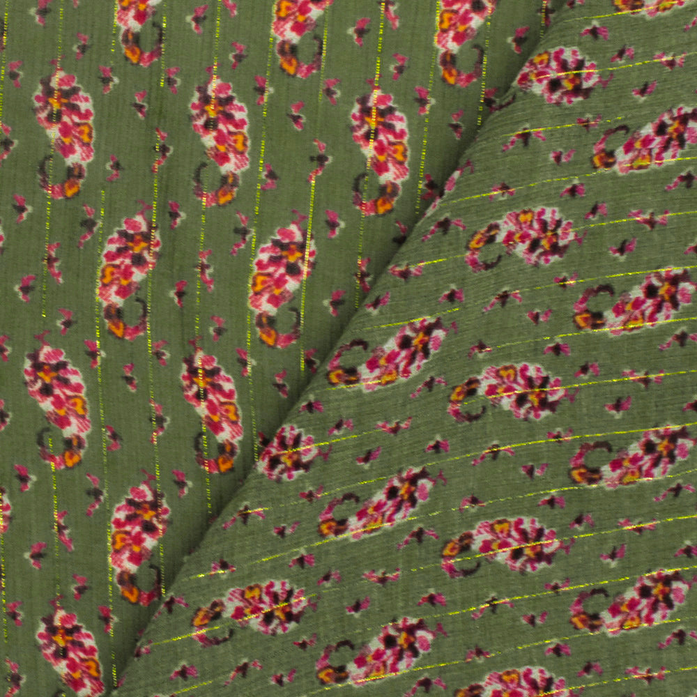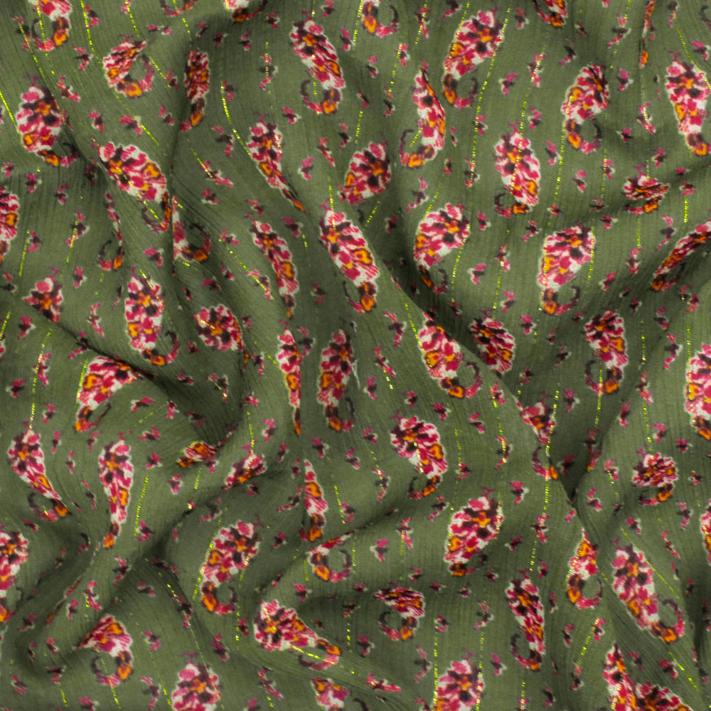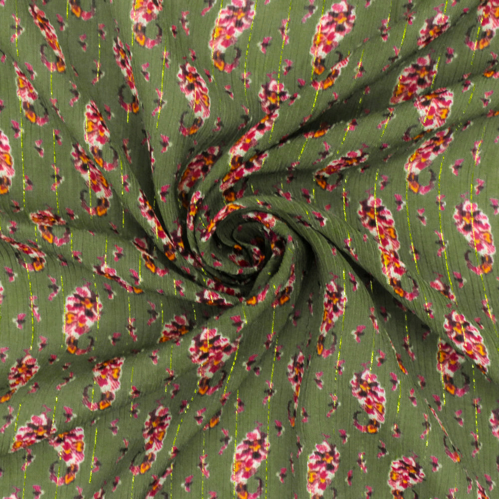 Olive-Multi Famous Designer Floral Printed Metallic Stripe Chiffon Fabric