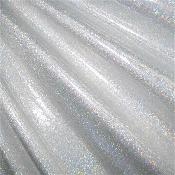 Metallic Silver Hologram Mini Dot Print on White Spandex Fabric 4 Way Stretch Suitable for Dancewear, Apparel, & Costumes 80% Nylon 20% Spandex 58" Wide