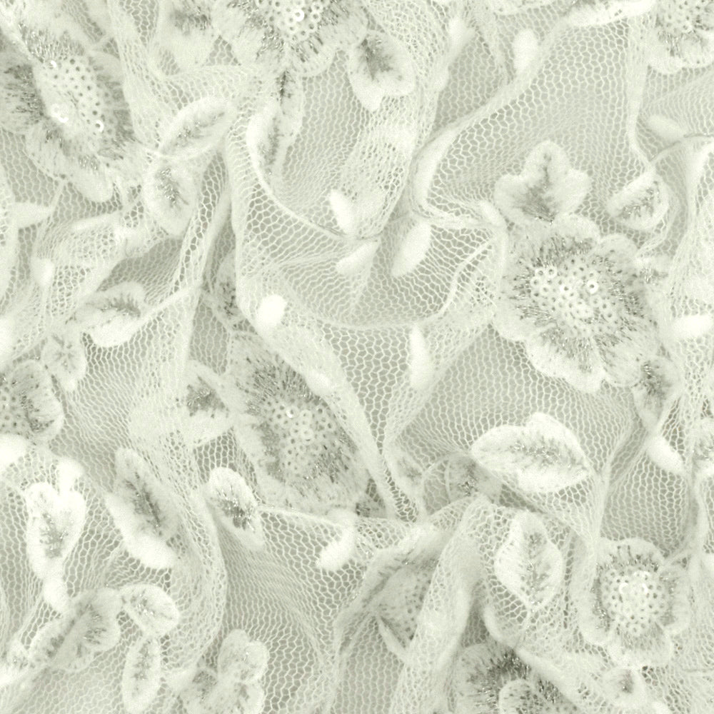 White-Silver Floral Metallic Sequin Embroidered Mesh Fabric