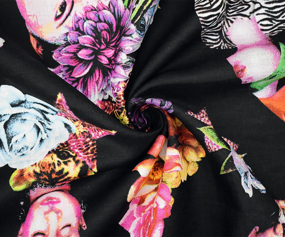 Black-Magenta-Multi Faces and Floral Printed Linen Woven Fabric