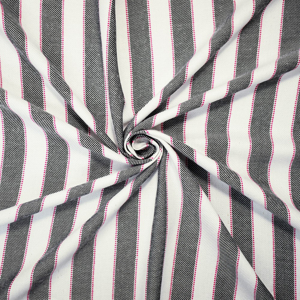 Black-White-Pink Rayon Famous Maker Vertical Stripe Twill Woven Fabric