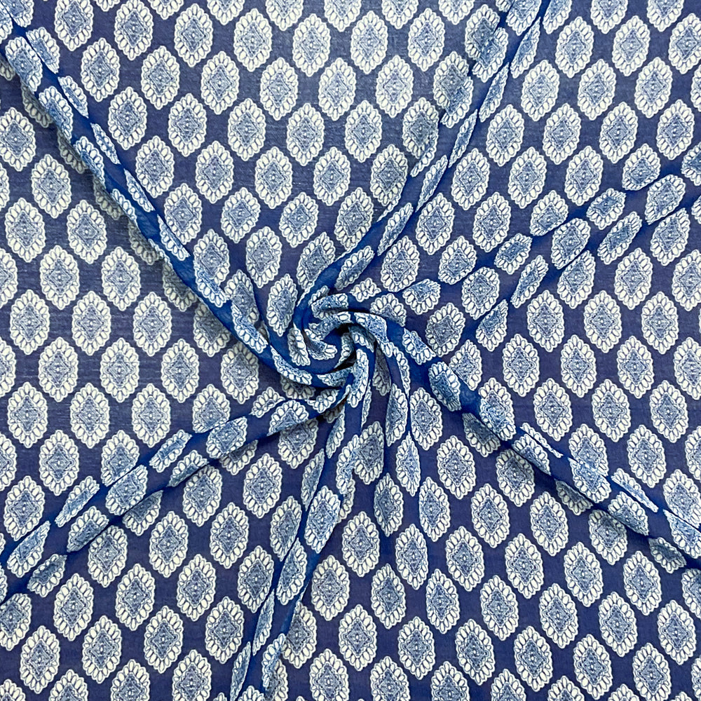 Blue-White Poly Moroccan Printed Silky Pebble Chiffon Woven Fabric