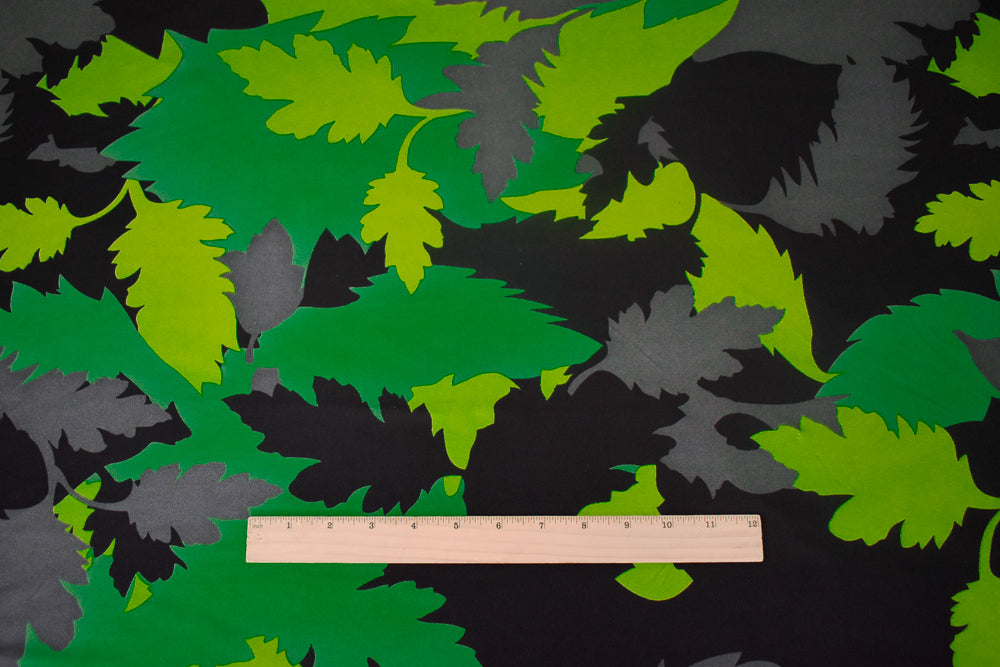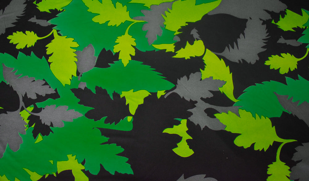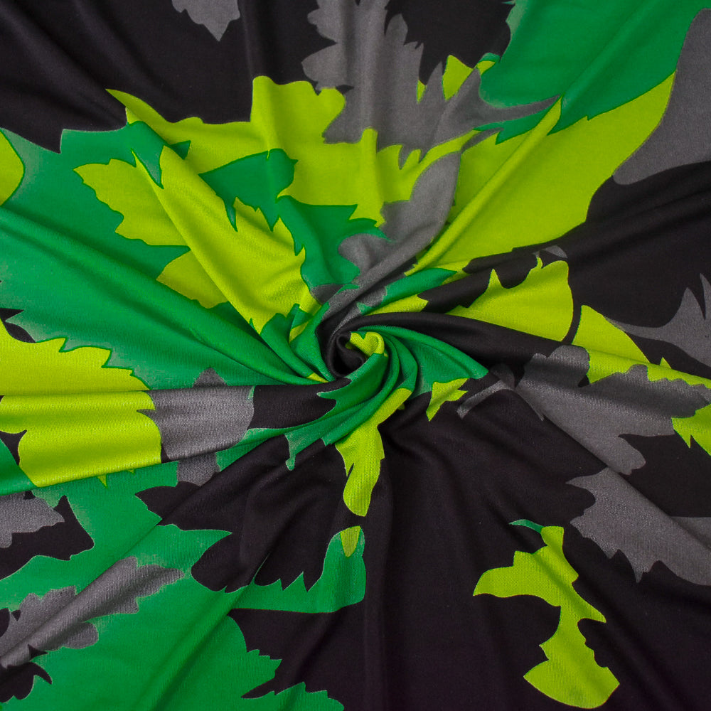 Green-Black-Gray Leaf Camo Printed Stretch Silk Jersey Knit Fabric