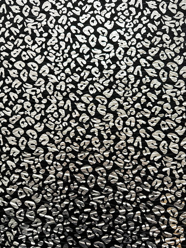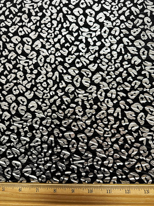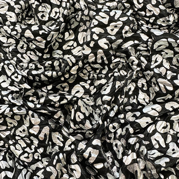 -Metallic Silver Animal Print on Black Semi Sheer Tissue Weight Stretch Knit Fabric