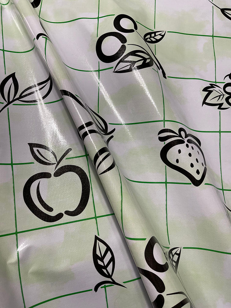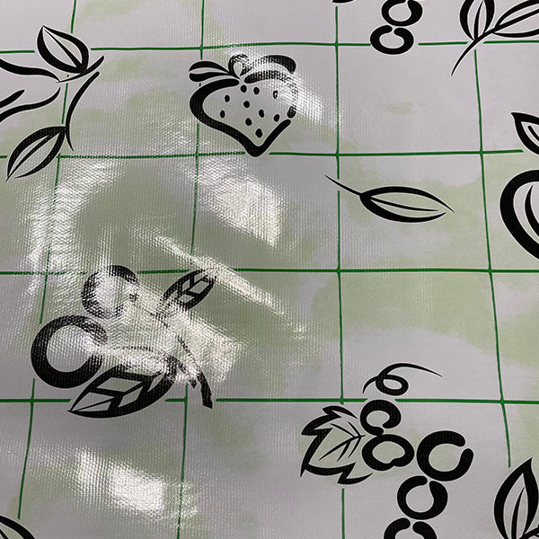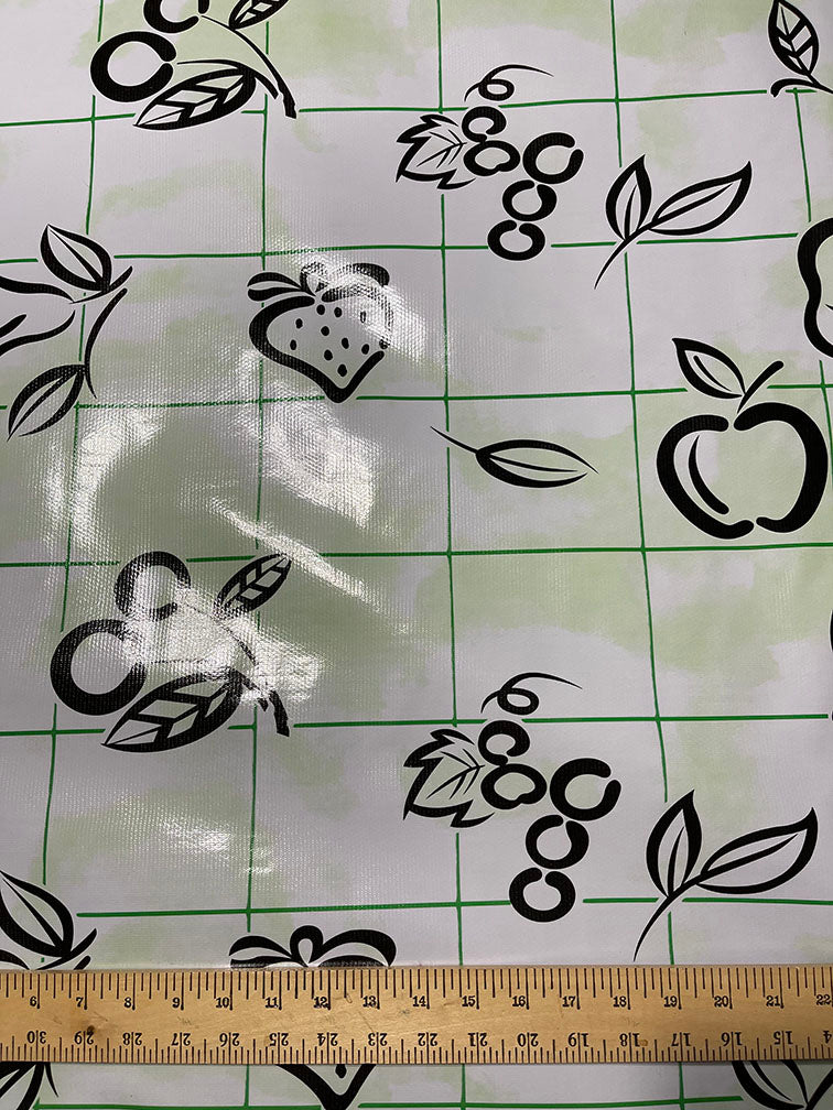 Black Fruit Print with Green Check Print and Light Green Shading on White Oilcloth Fabric