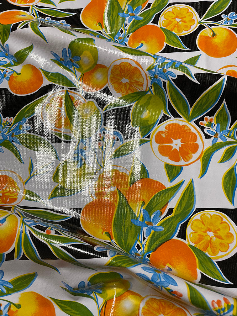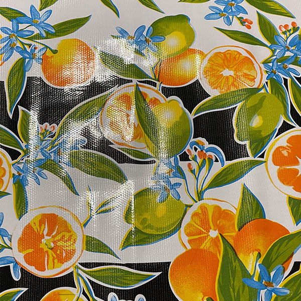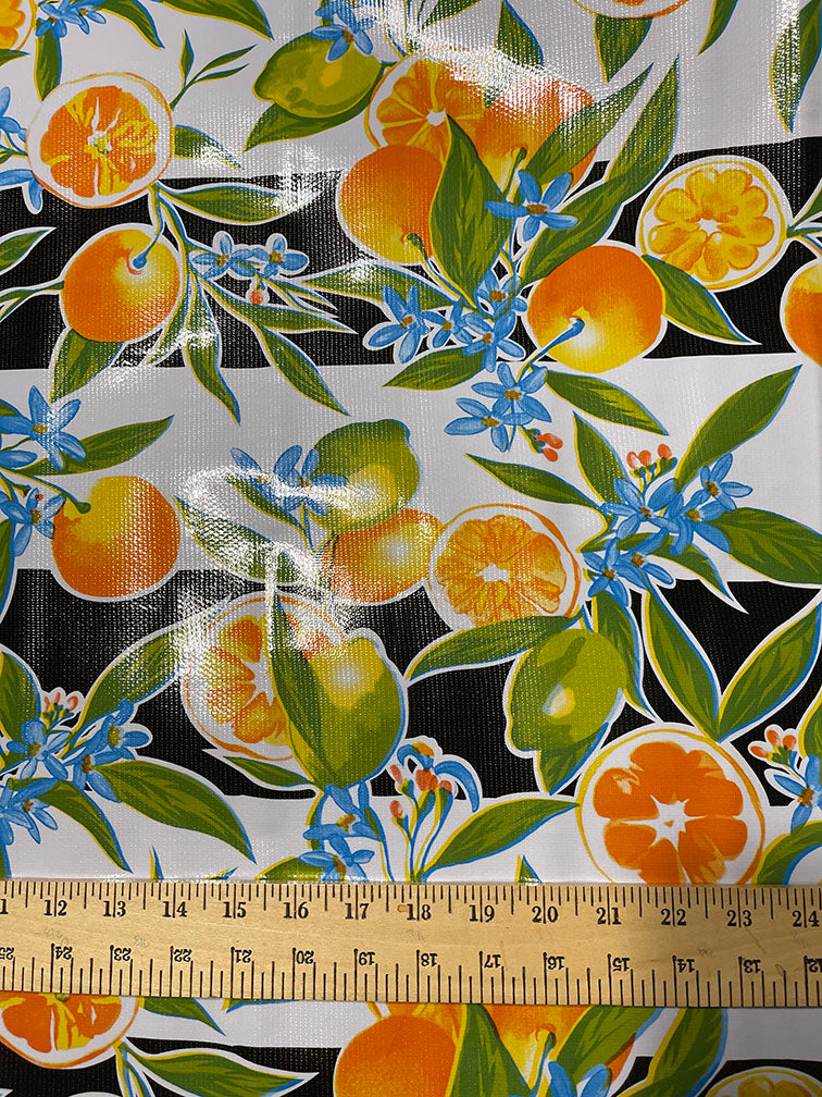 Orange and Lime Print Floral Limb Print on White and Black Stripe Oilcloth Fabric