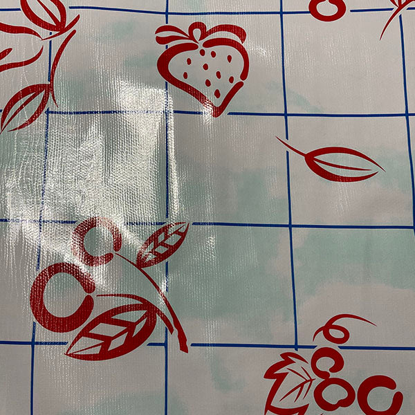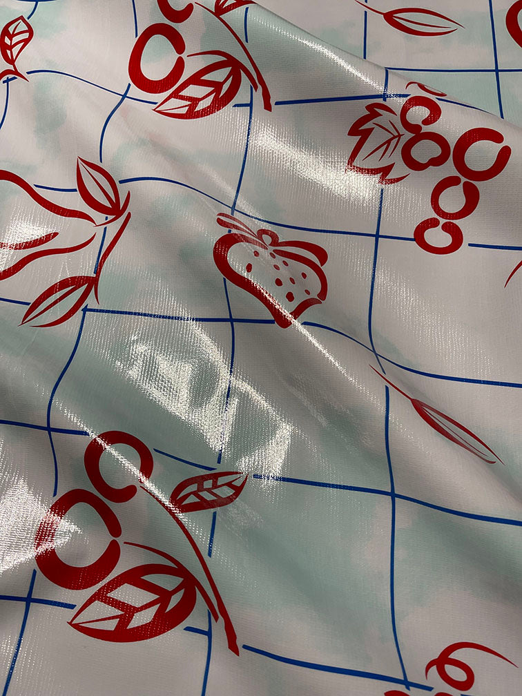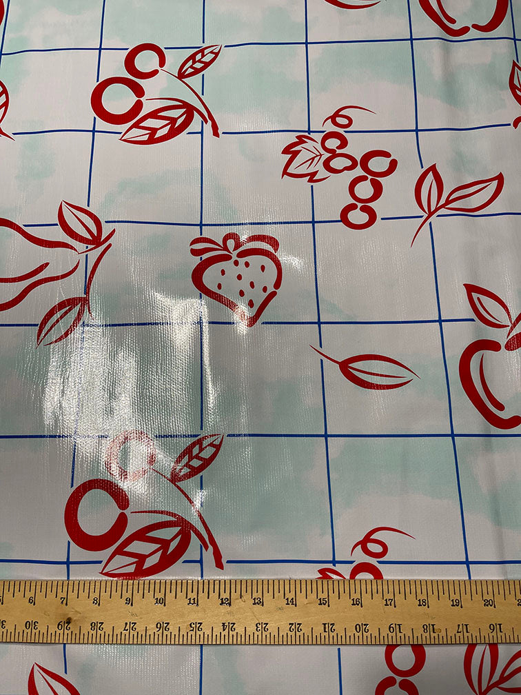 Red Fruit Print with Blue Check Print and Aqua Shading on White Oilcloth Fabric