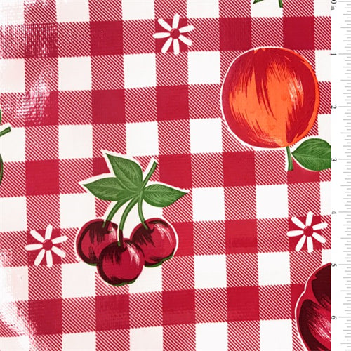 Red, Green, Orange, Brown, and White Fruit and Floral Print on Red and White Check Oilcloth Fabric