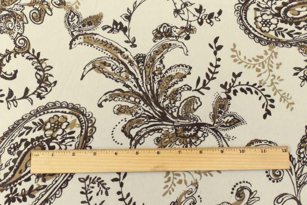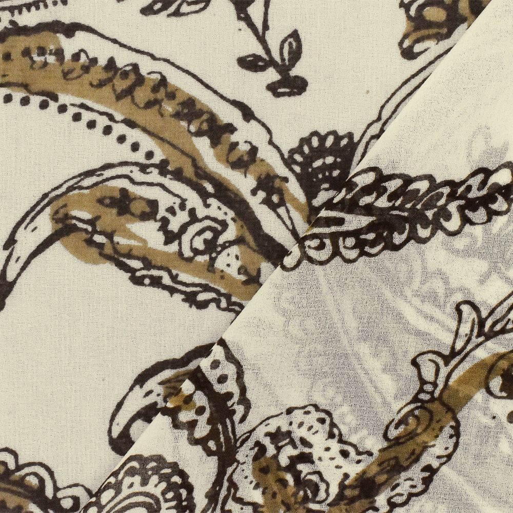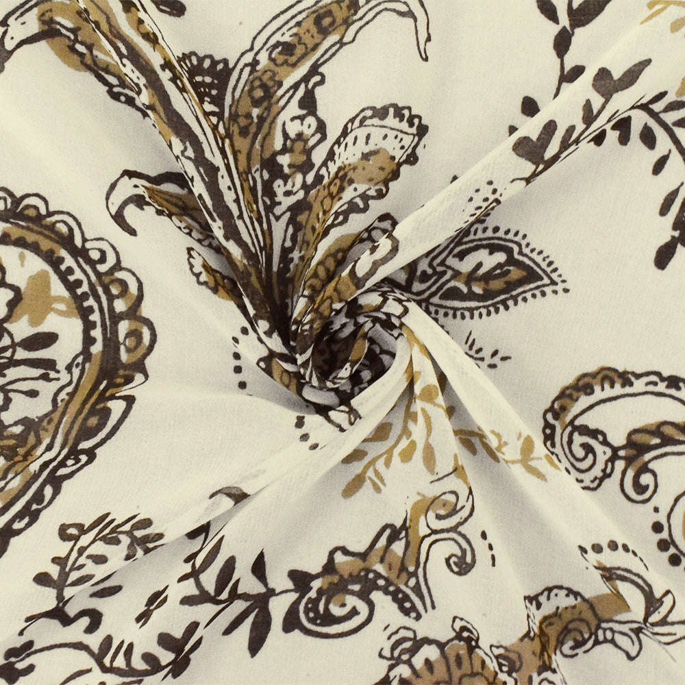 Ivory-Brown-Beige Paisley Printed Poly Chiffon Woven Fabric