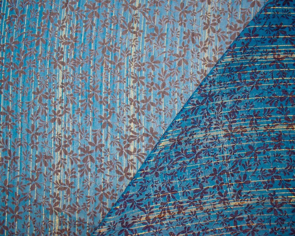 Blue-Gold-Multi Floral Printed Metallic Crinkle Yoryu Chiffon Woven Fabric