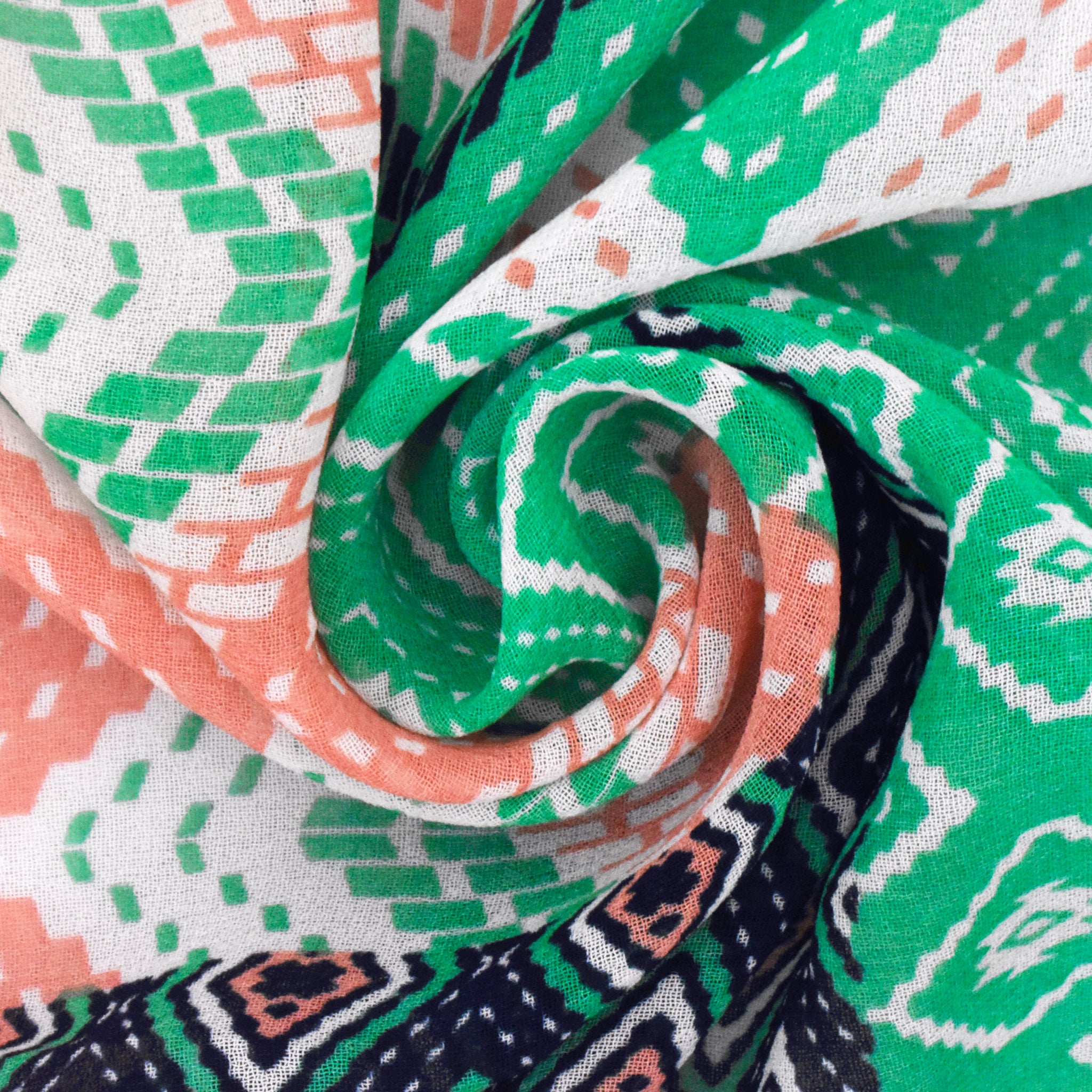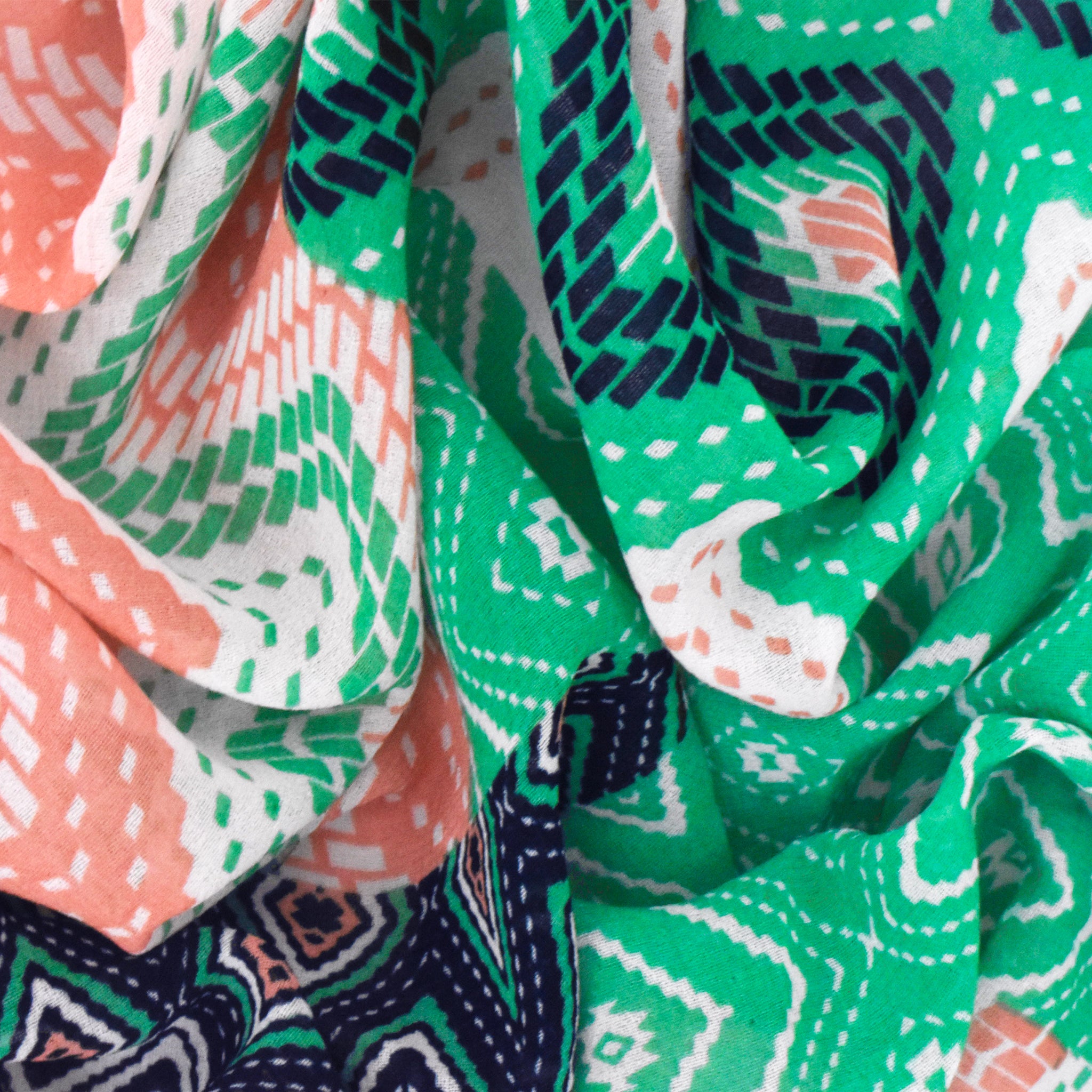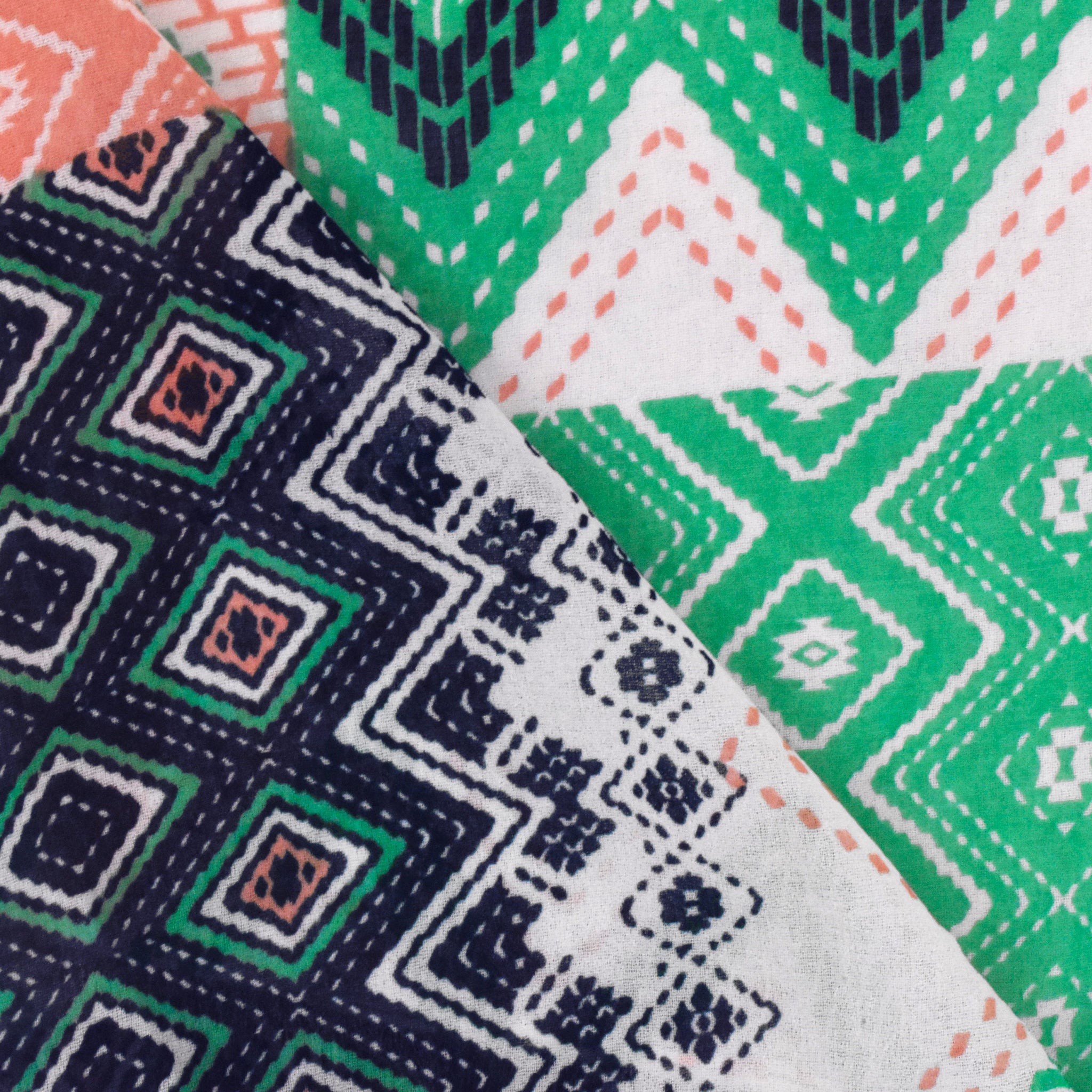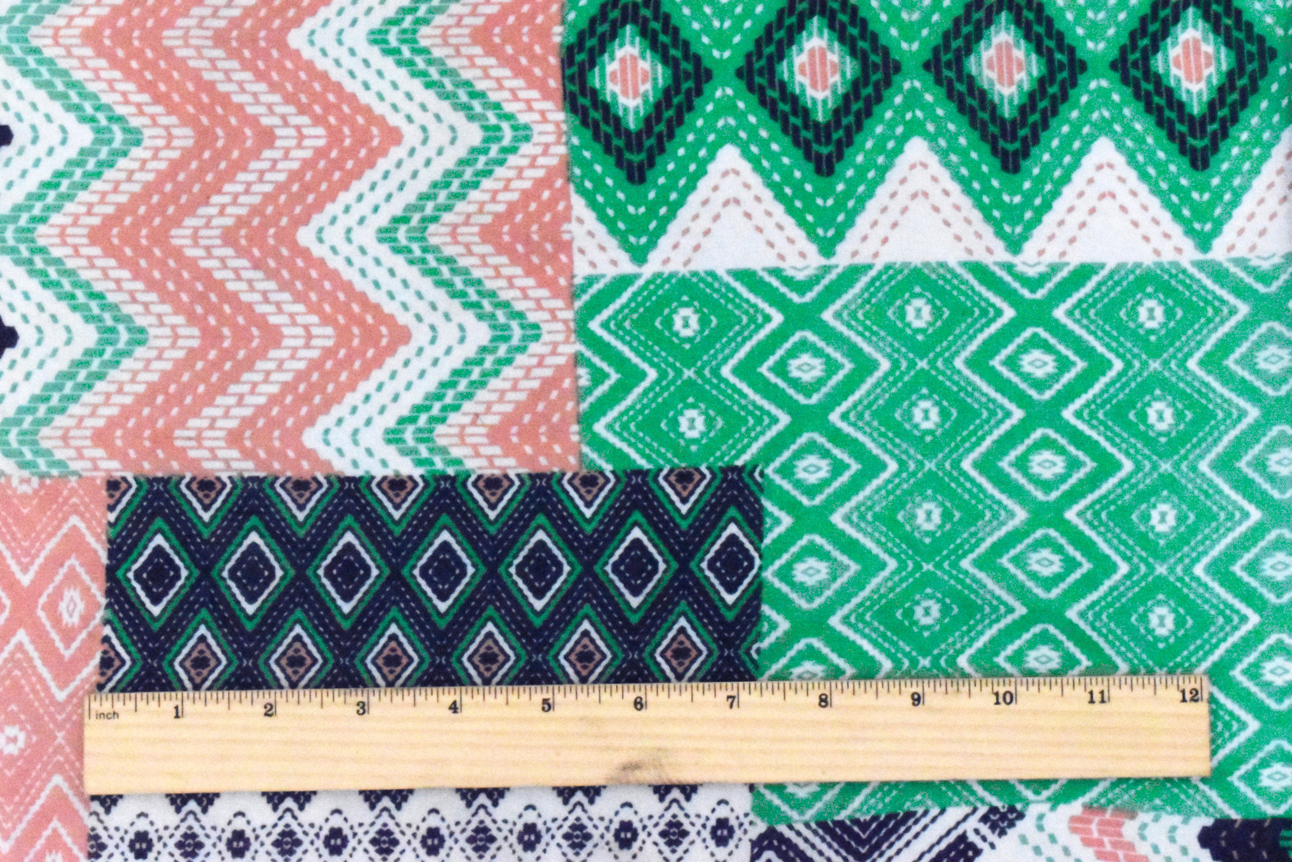 Coral Orange-Green-Multi Chevron Patch Printed Chiffon Woven Fabric