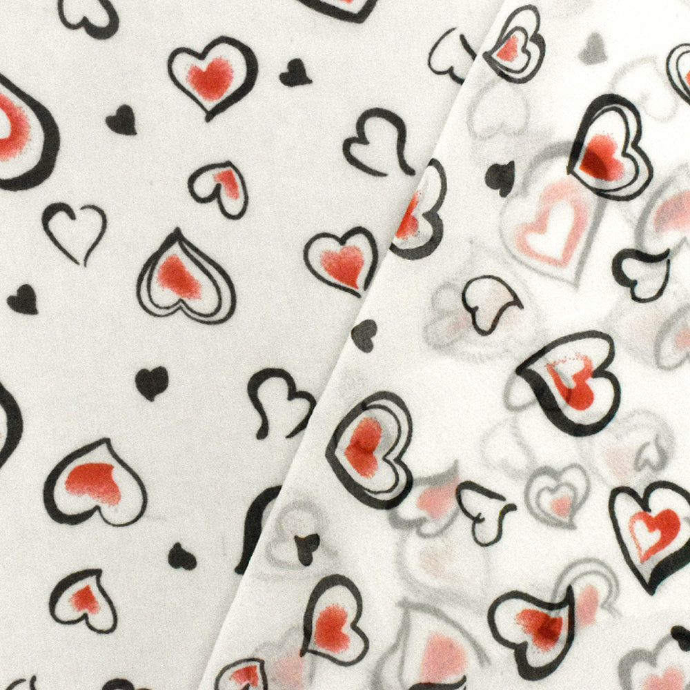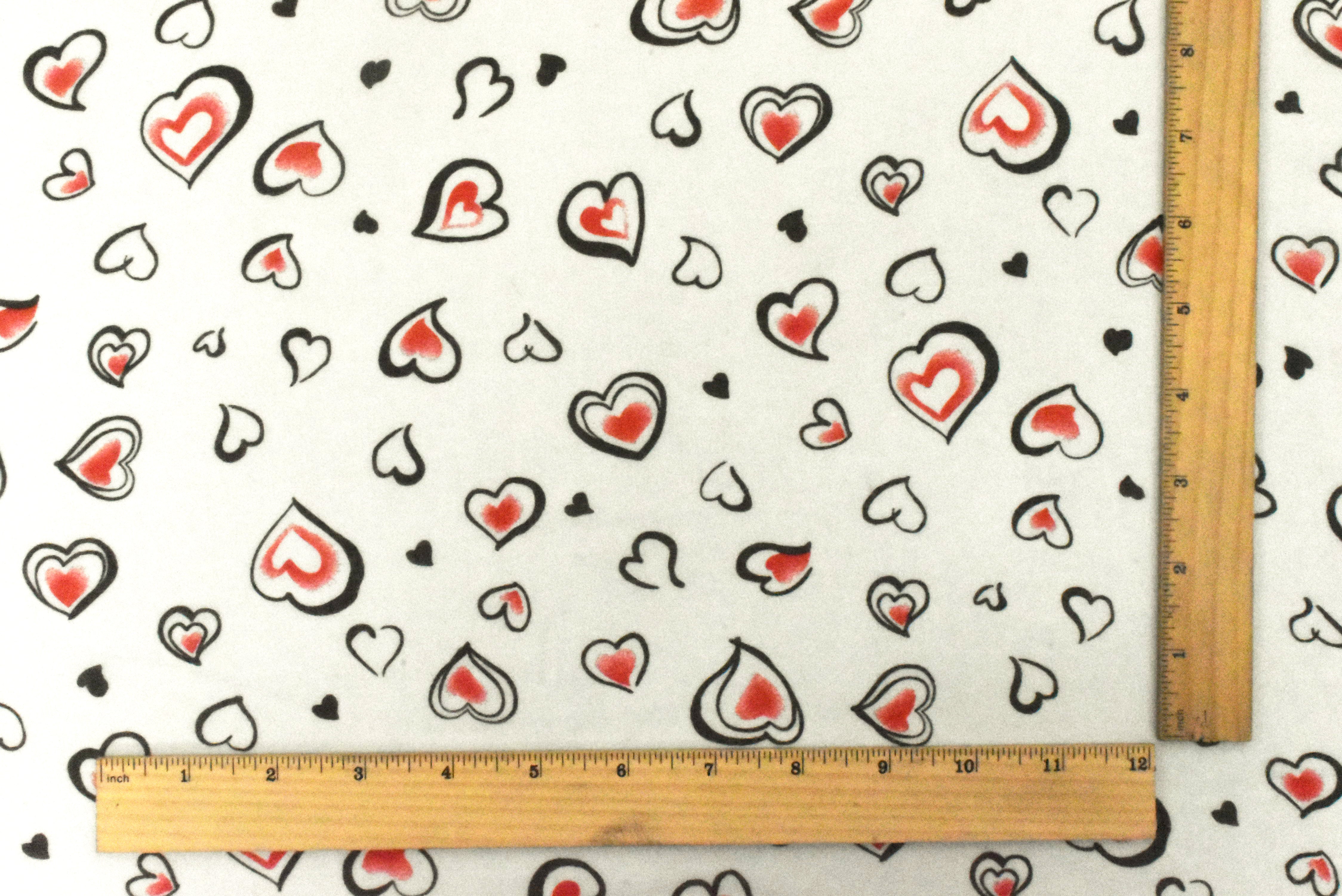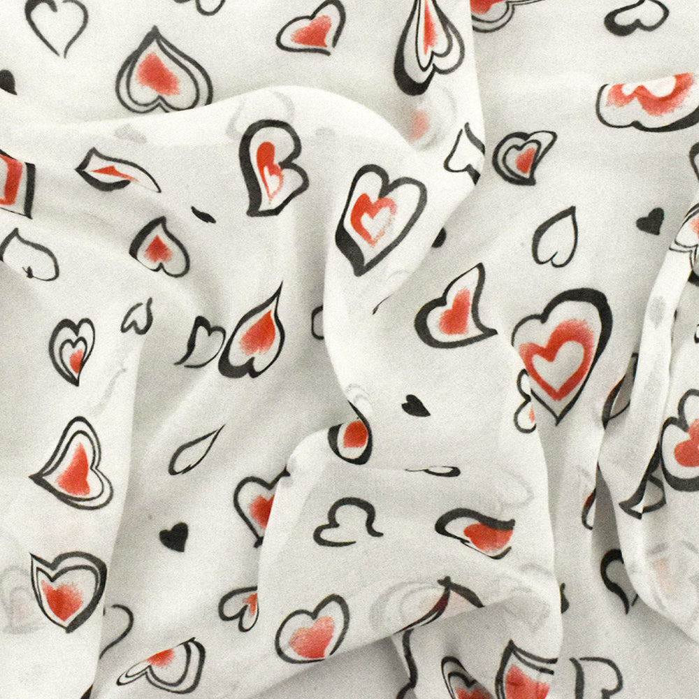 Ivory-Black-Red Heart Printed Poly Chiffon Woven Fabric