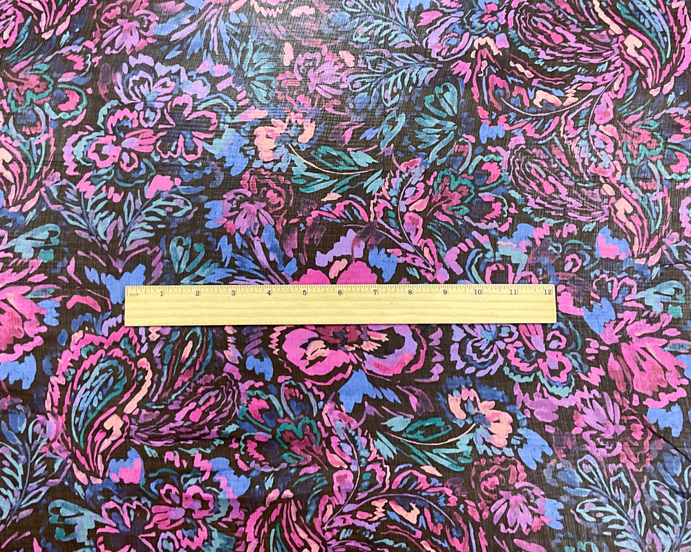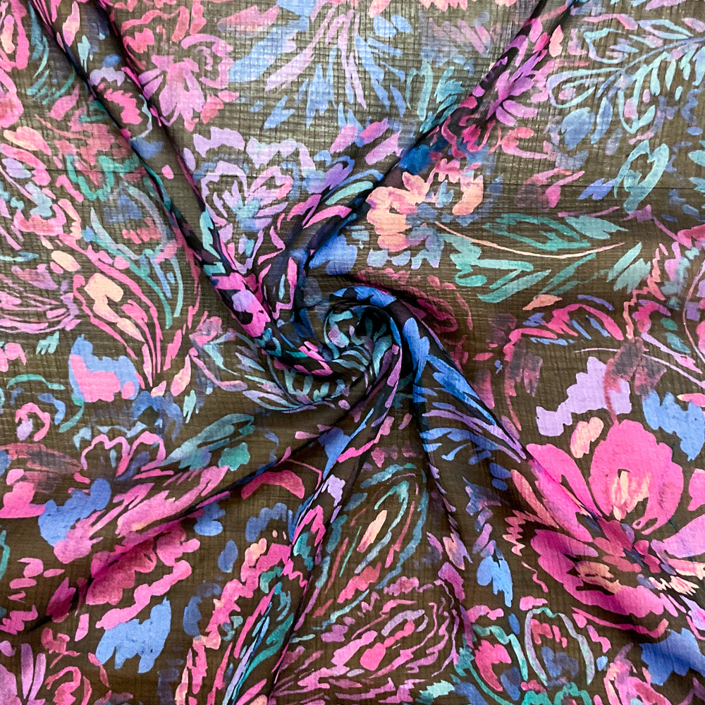 Purple-Black-Multi Poly Ink Floral Printed Crinkle Yoryu Chiffon Woven Fabric
