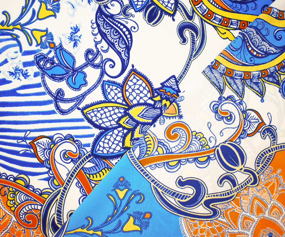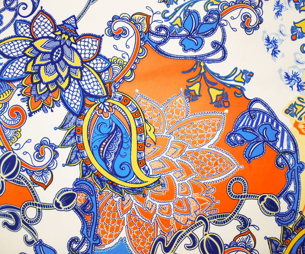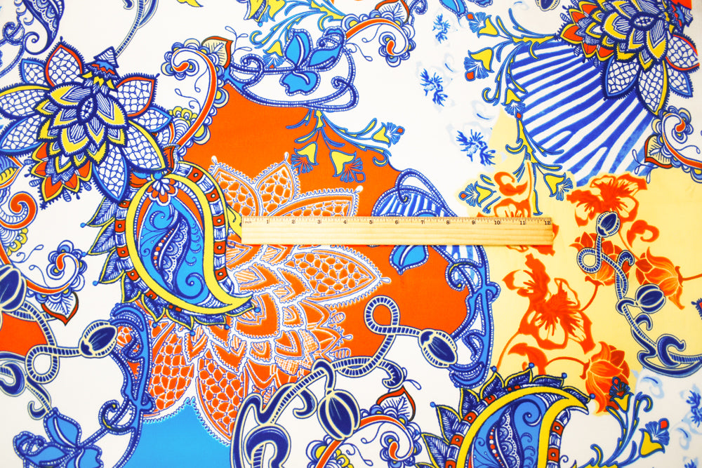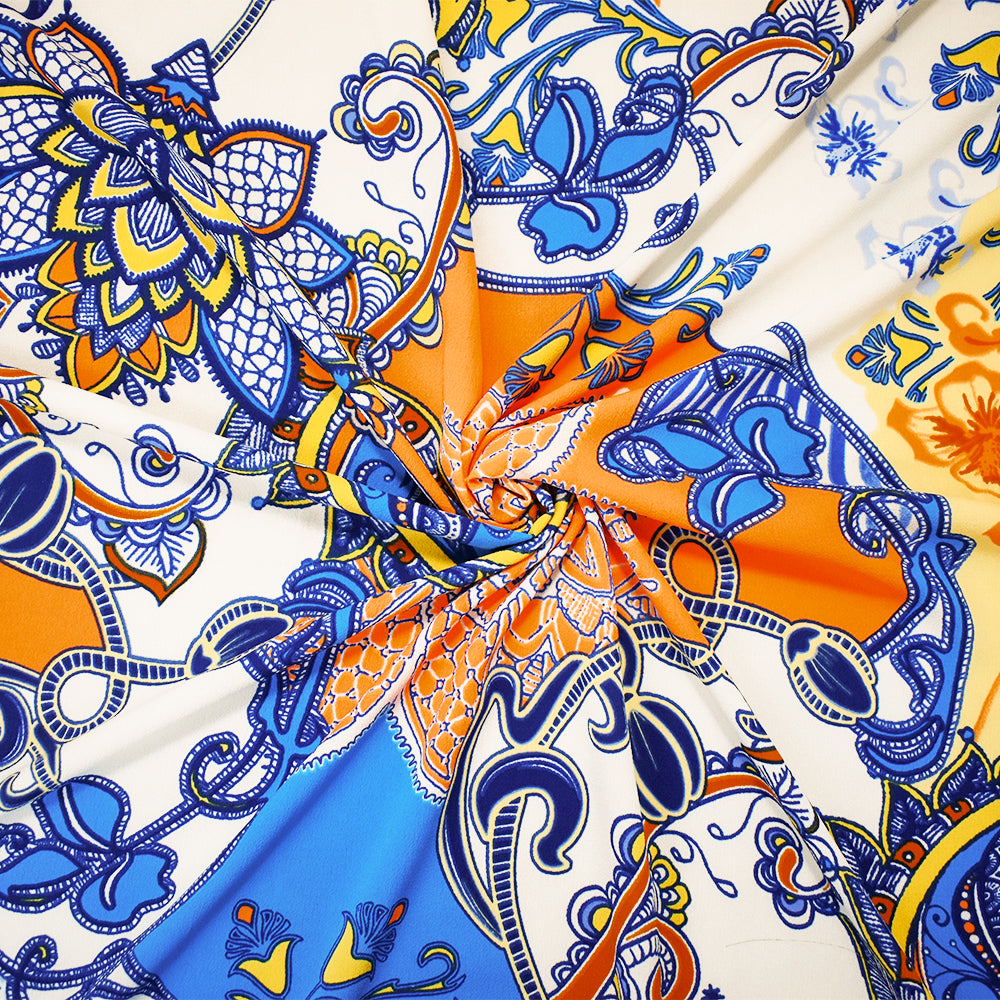 Blue-Ivory-Multi Poly Paisely Floral Print Pebble Crepe Woven Fabric