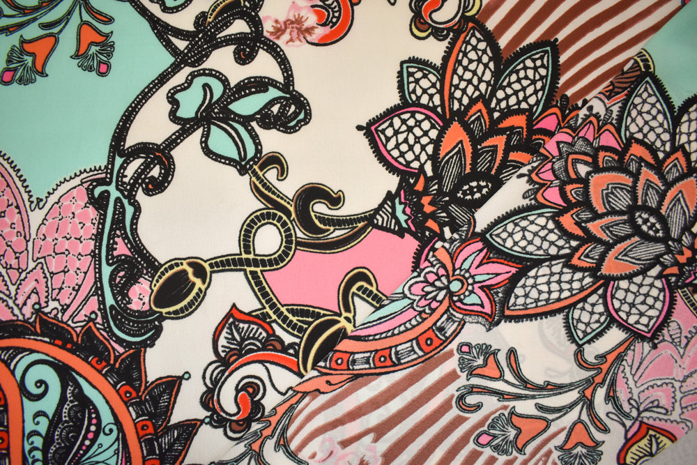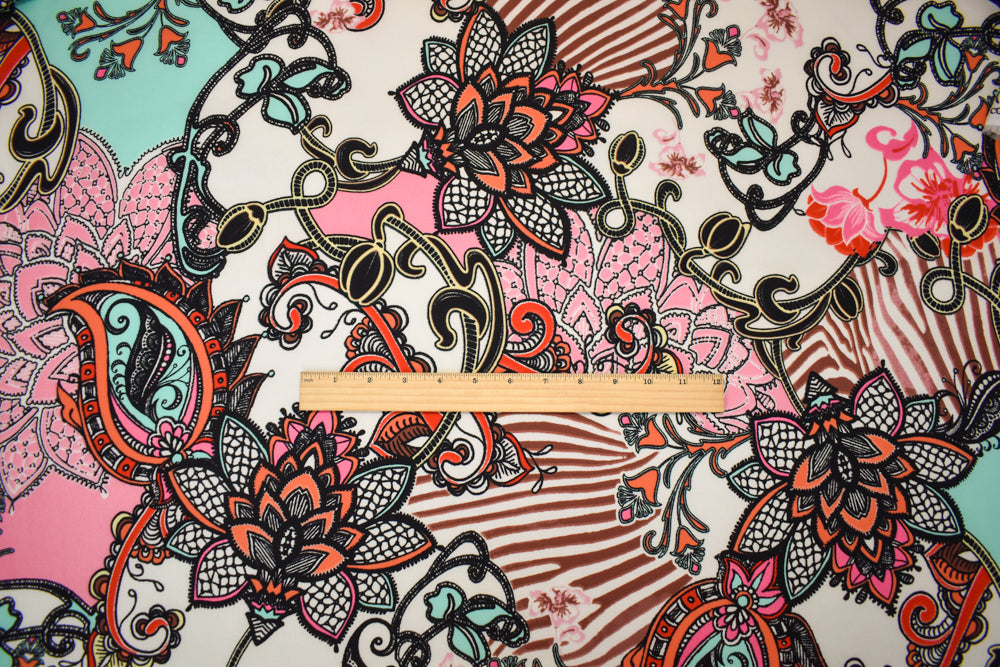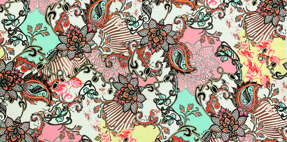 Ivory-Turquoise-Multi Poly Paisely Floral Print Pebble Crepe Woven Fabric