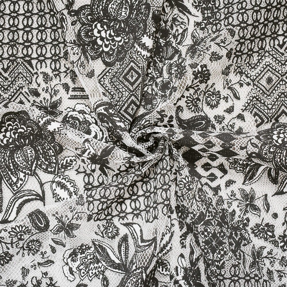 Black-White Poly Floral Patch Printed Lace Mesh Knit Fabric