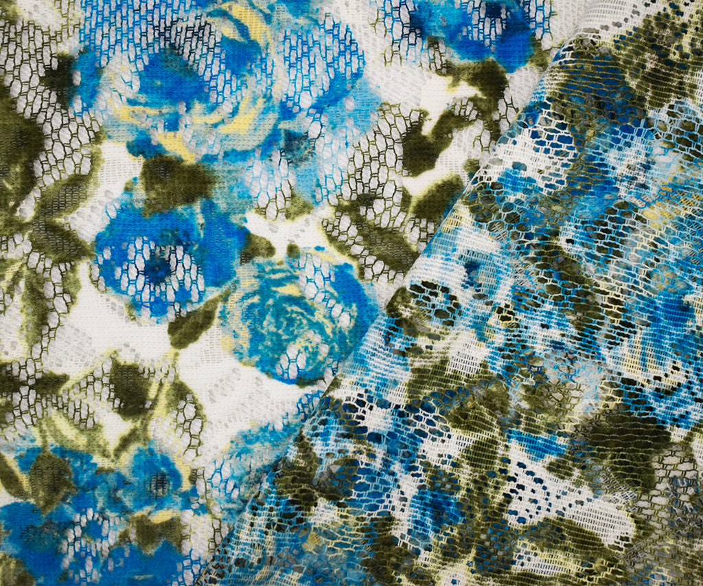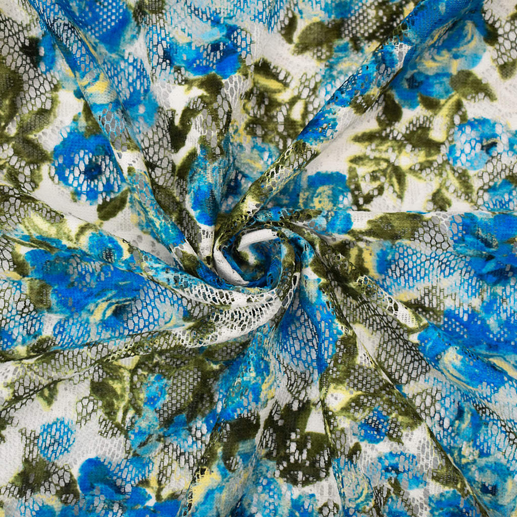 Blue-Green-Multi Poly Nylon Floral Printed Crochet Lace Mesh Knit Fabric