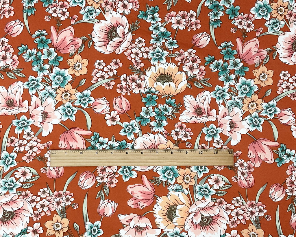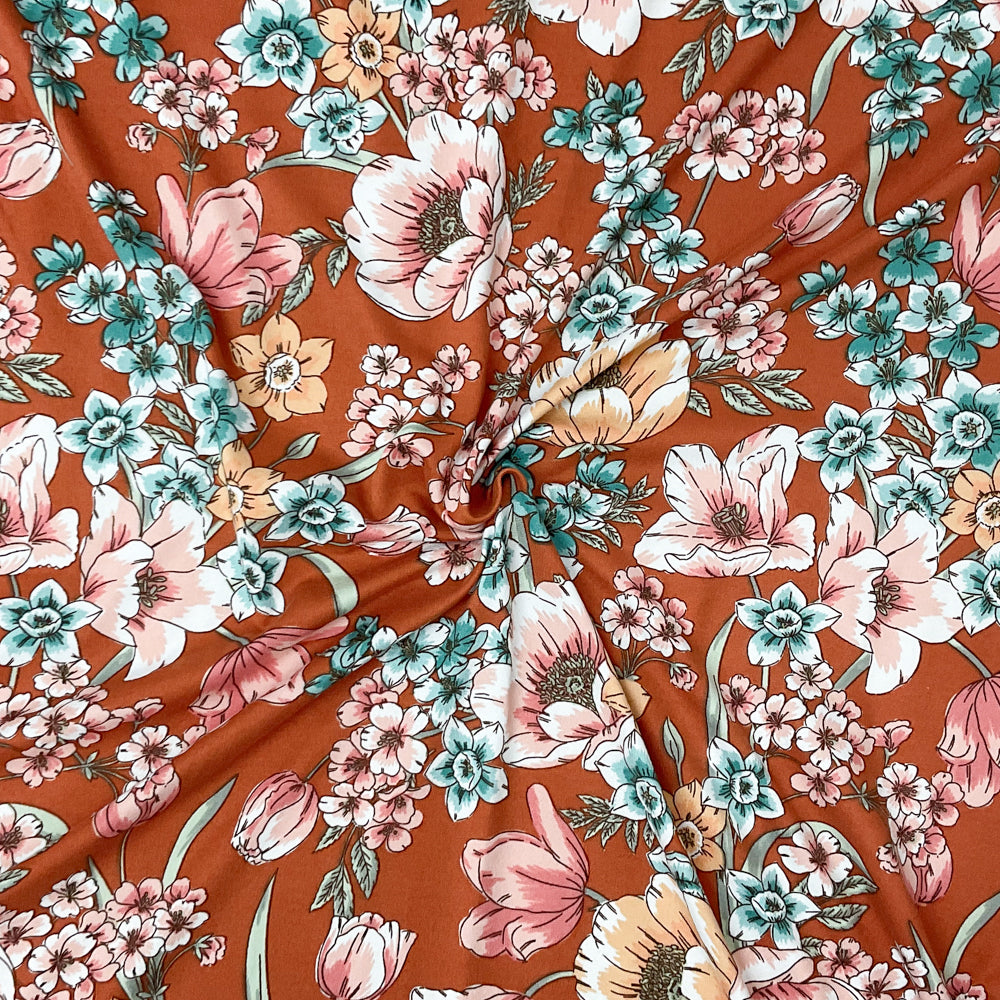 -Orange-Multi Poly Spandex Stretch Floral Print Double Brush Jersey Knit Fabric