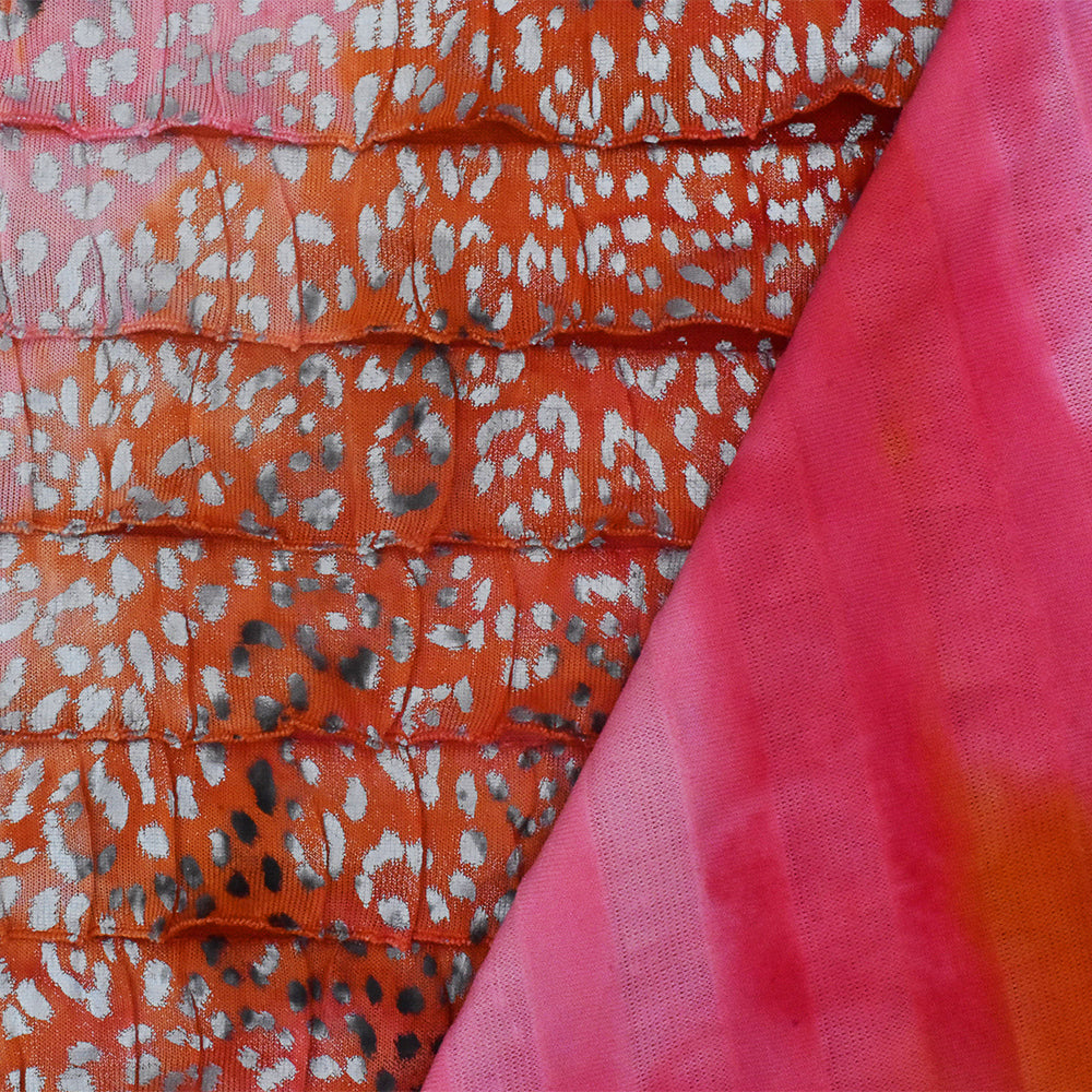 Orange-Pink-Multi Cheetah Printed Tie Dye Stretch Poly Ruffle Knit Fabric