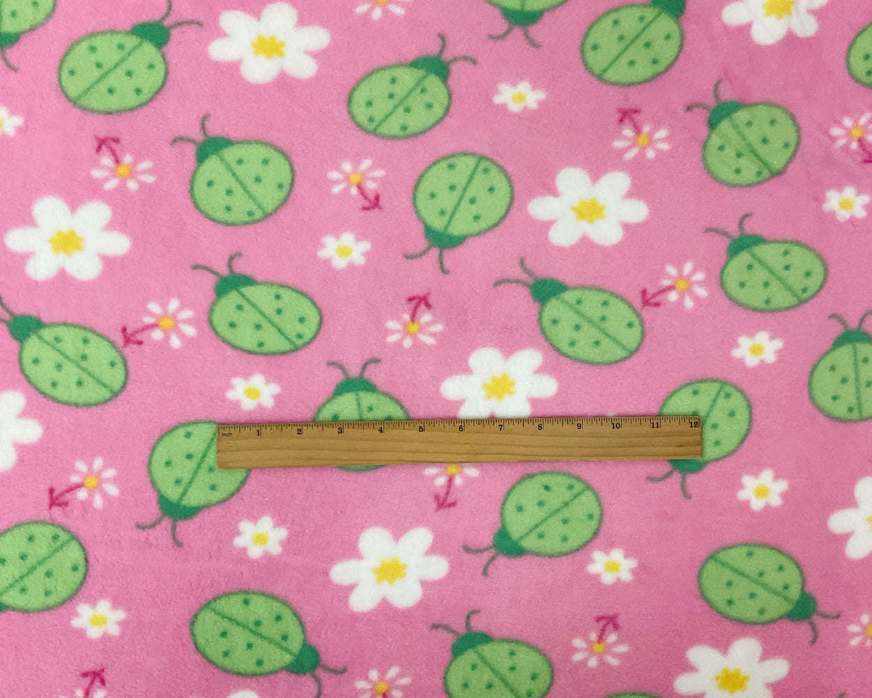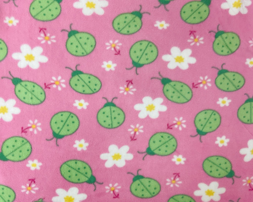 Pink-Green-Multi Polyester Ladybug Floral Printed Polar Fleece Knit Fabric