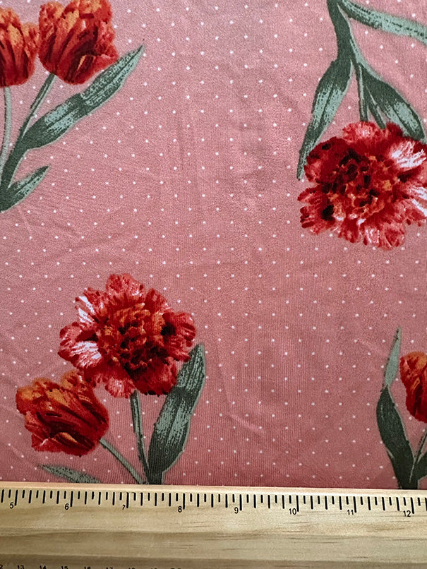 -Red, Orange, & Green Floral w/ White Polka Dot Print on Salmon Pink ITY Jersey Knit Fabric