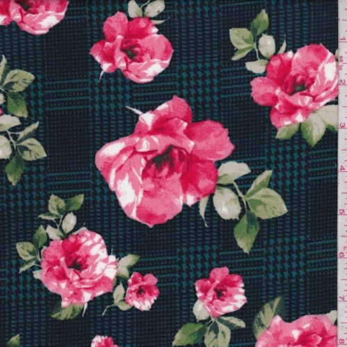 Teal/Pink Glen Plaid Floral Double Brushed Jersey Knit Fabric