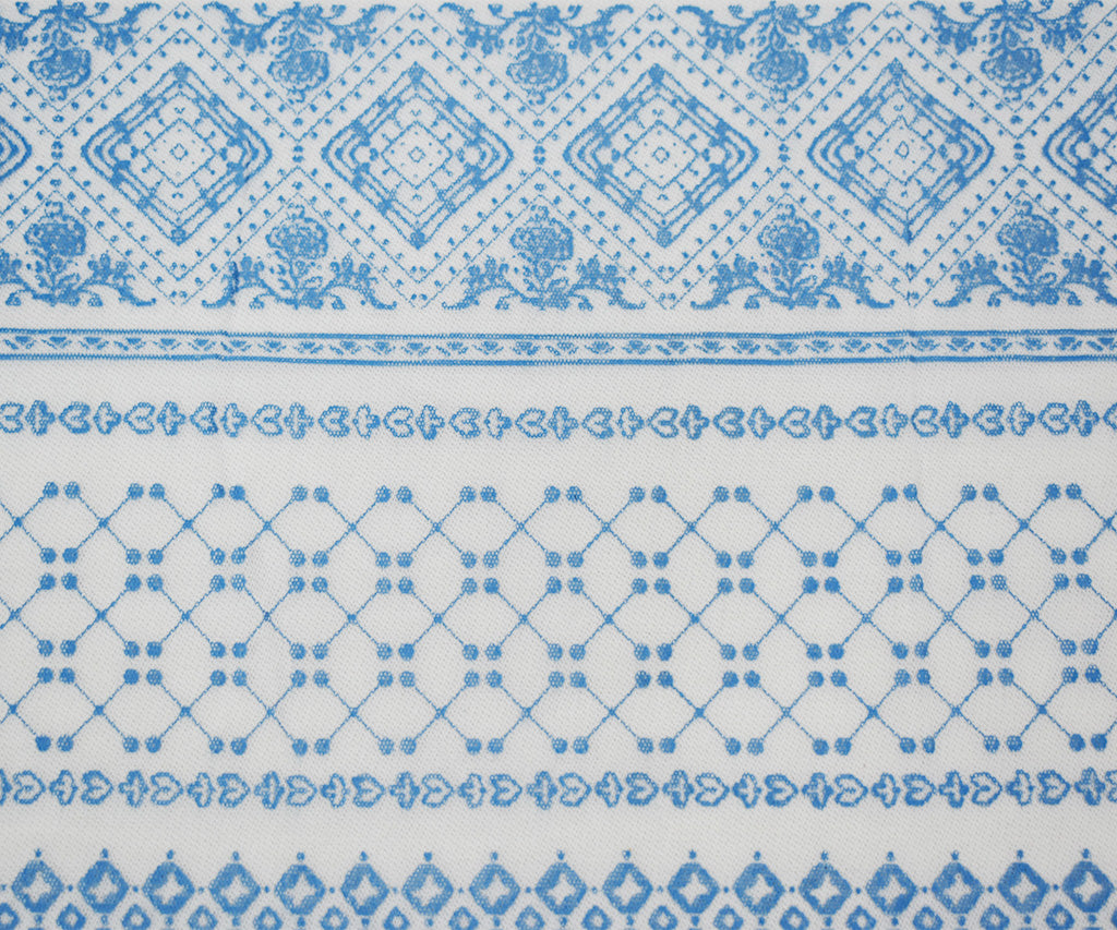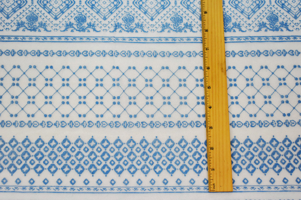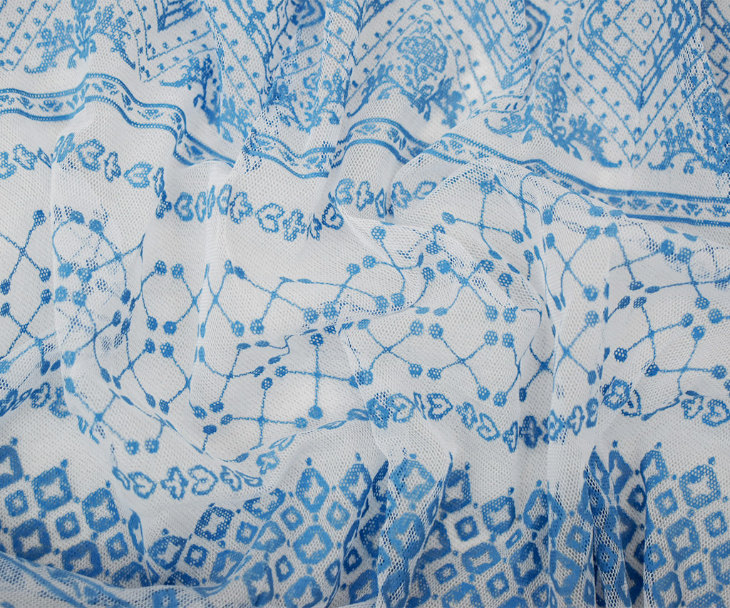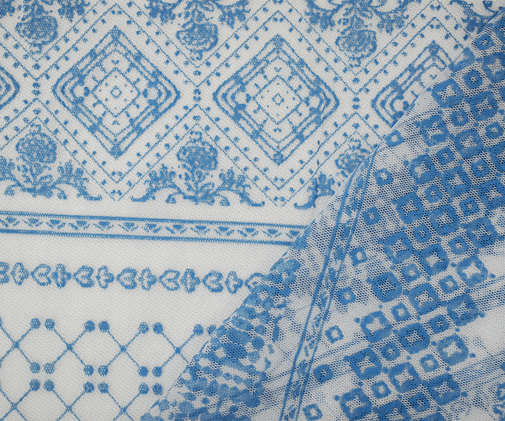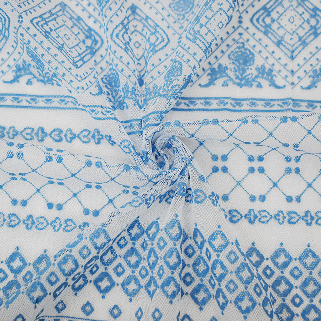 White-Blue Poly Stretch Diamond Multi Pattern Stripe Print Mesh Tulle Fabric