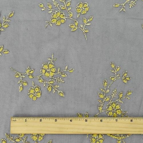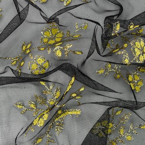 2 1/4 YD PC-Black/Yellow/Gold Floral Glitter/Bead Flock Mesh Fabric