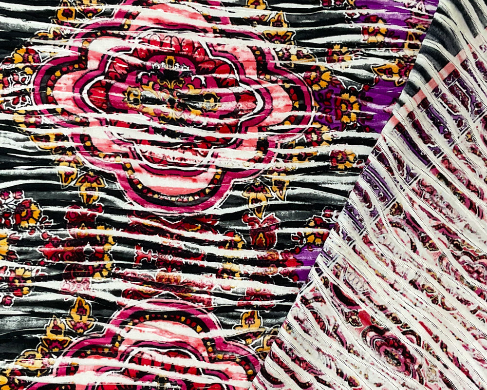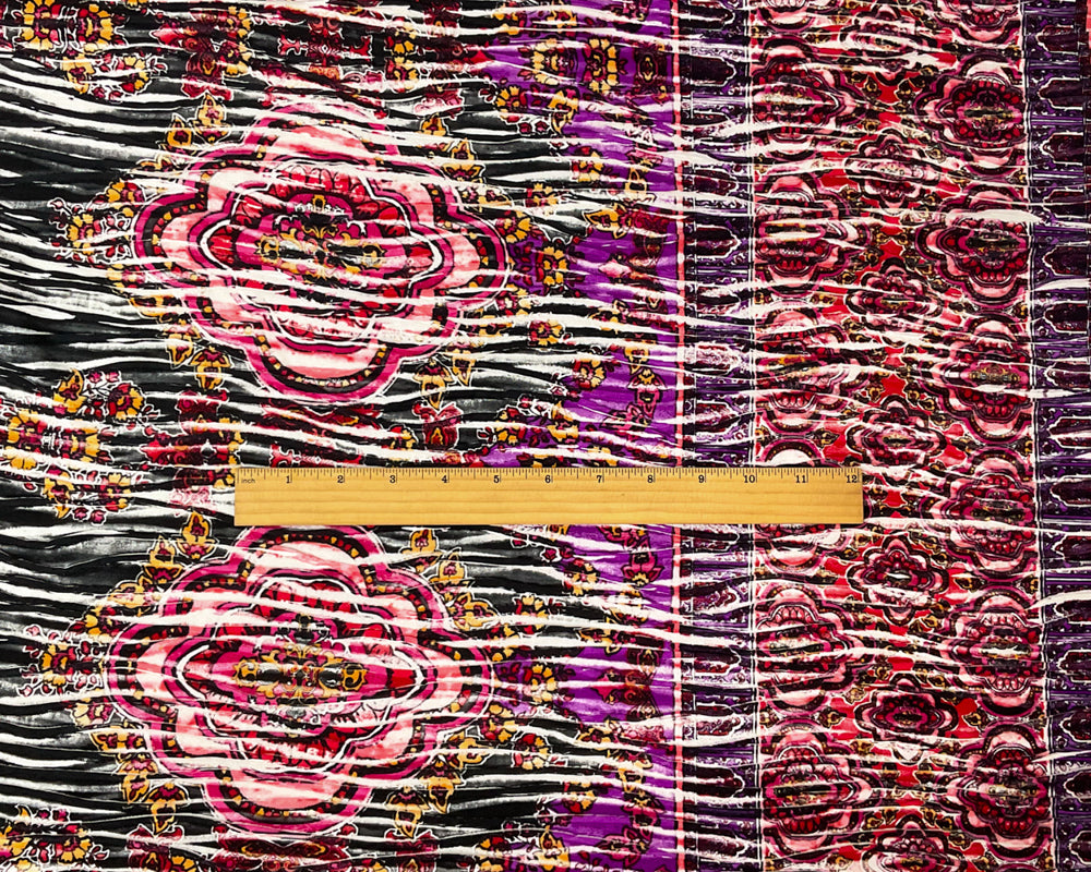 Red-Black-Multi Poly Medallion Border Printed Knife Pleat Knit Fabric