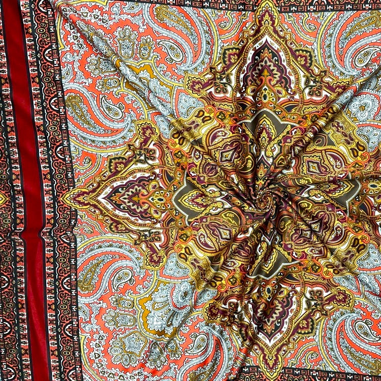 -Red-Orange-Multi Polyester Paisley Bandana PANEL Printed Charmeuse Woven Fabric