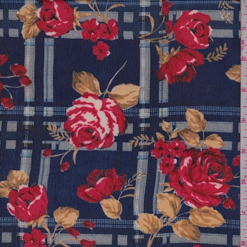 Navy/Ruby Plaid Floral Crepe Georgette Fabric
