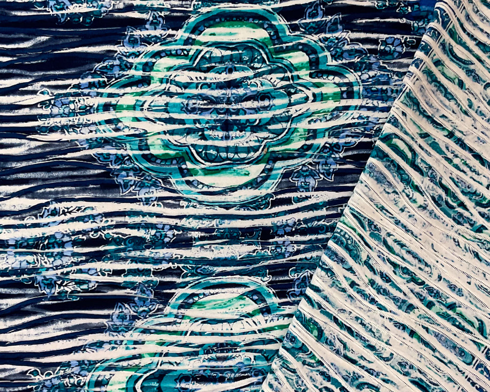 -Intricate blue and multi-colored medallion-inspired pattern with borders printed on a pleated knit fabric