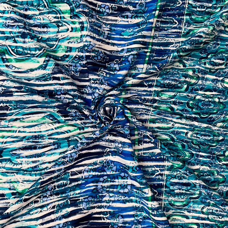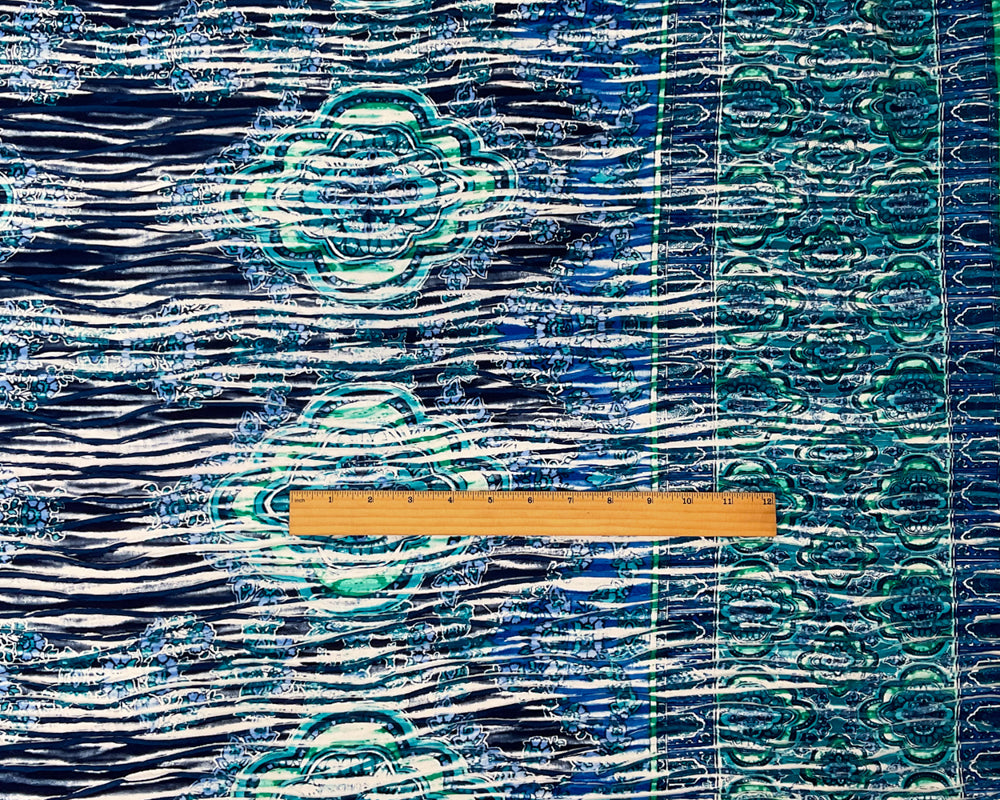 Blue-Multi Poly Medallion Border Printed Knife Pleat Knit Fabric