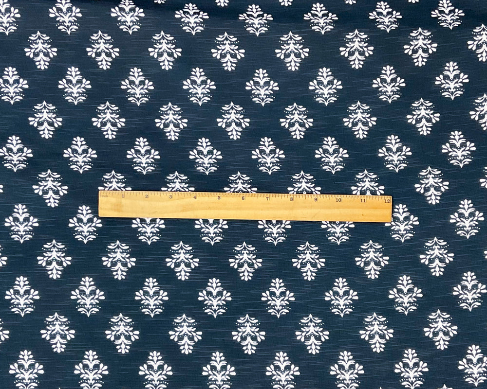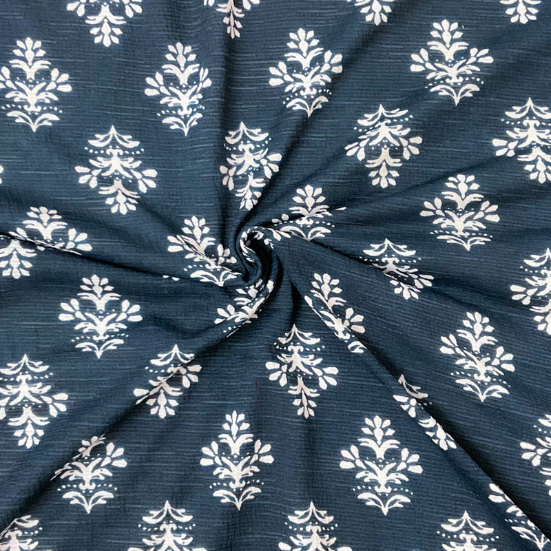 -Blue-White Poly Stretch Spandex Damask Floral Inspired Pattern Printed Slub Knit Fabric