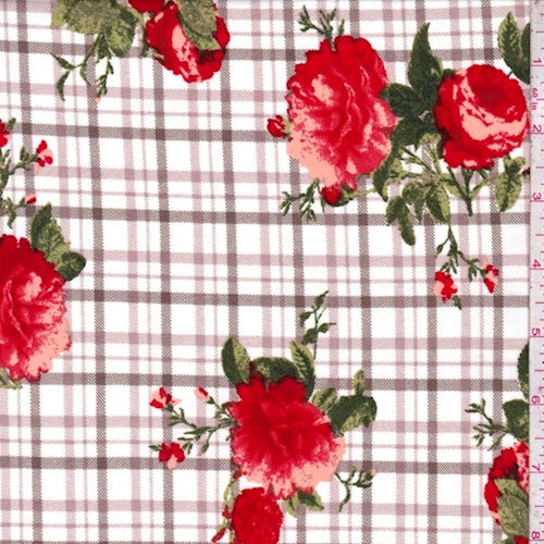 White/Red Plaid Floral Double Brushed Jersey Knit Fabric